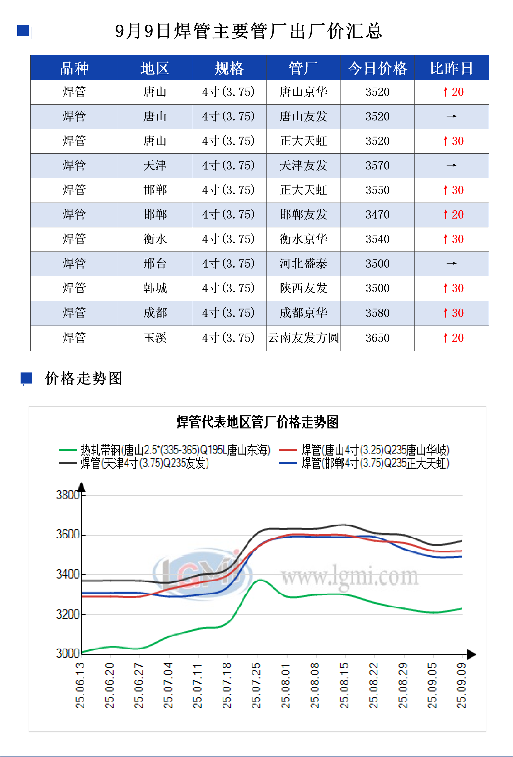 • 9月8日主流焊接钢管及上游品种出厂价格汇总