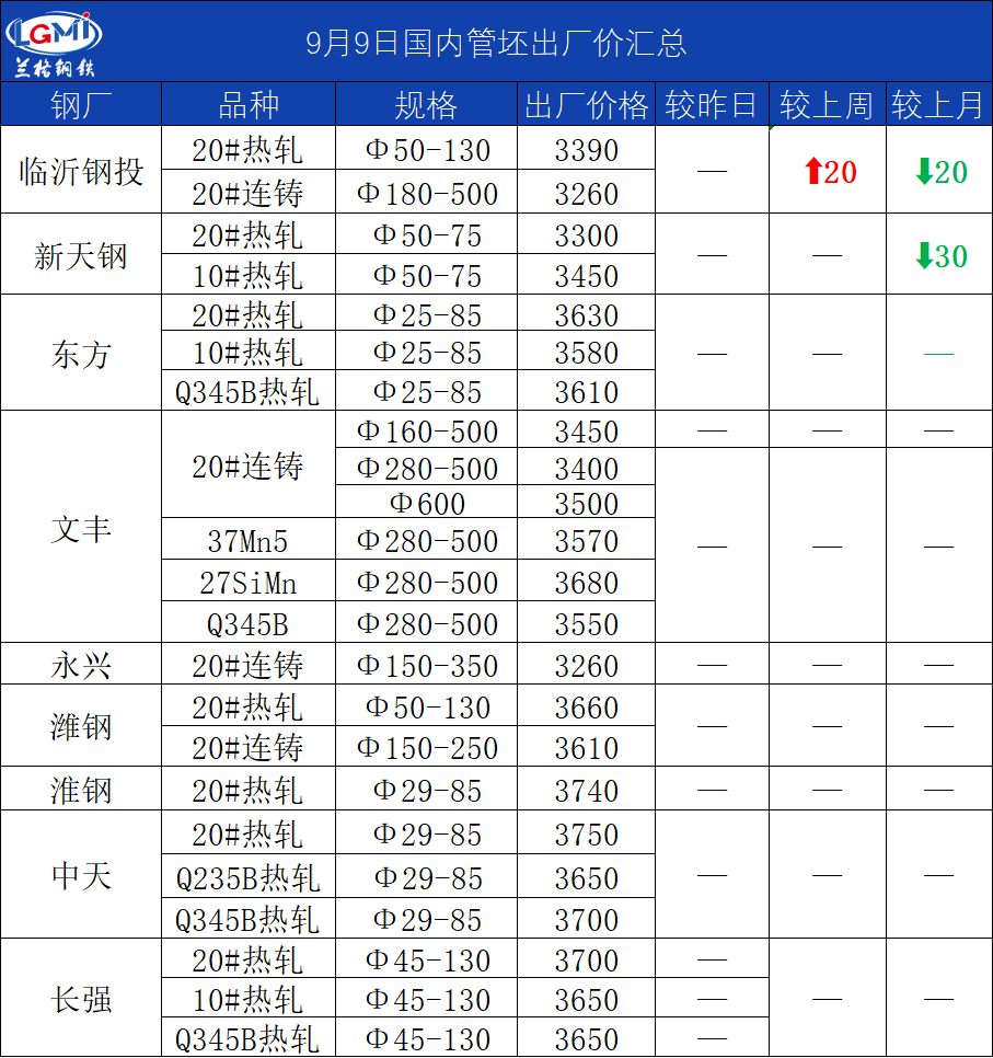• 9月9日(11:00)主导钢厂20#热轧管坯出厂价