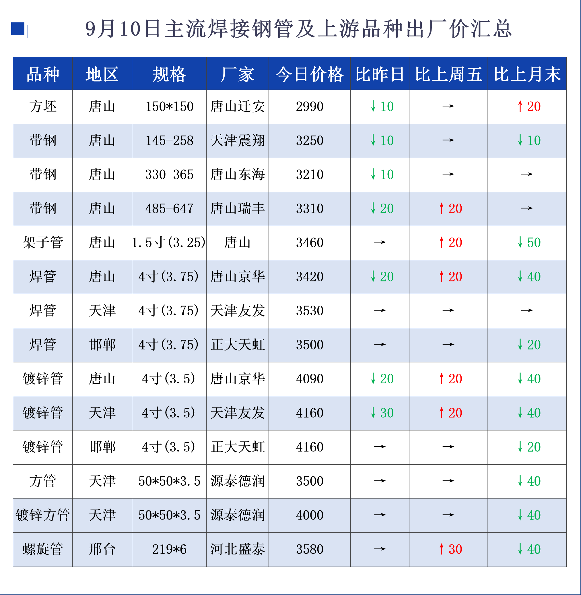 • 9月10日主流焊接钢管及上游品种出厂价格汇总
