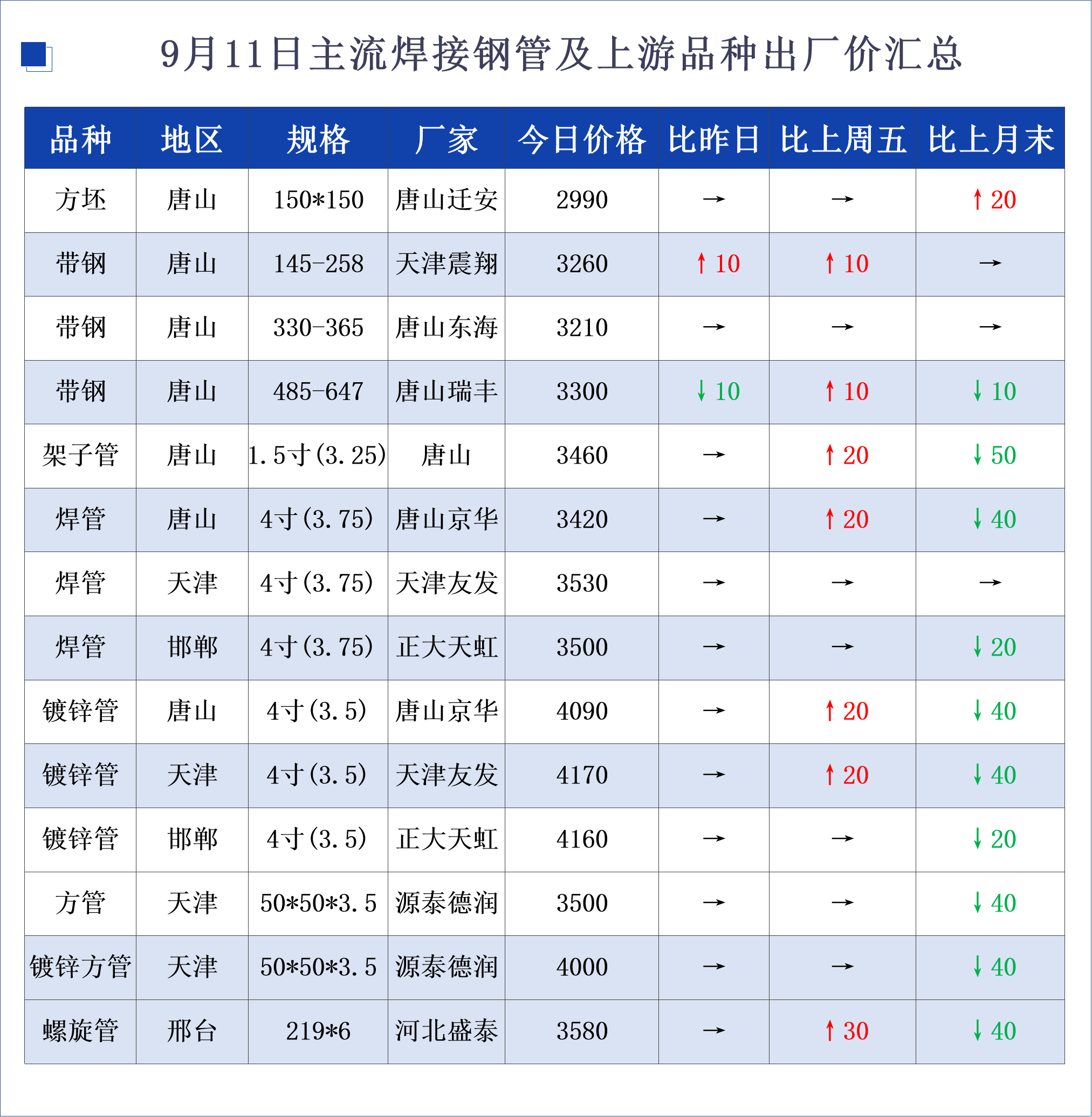 • 9月11日主流焊接钢管及上游品种出厂价格汇总
