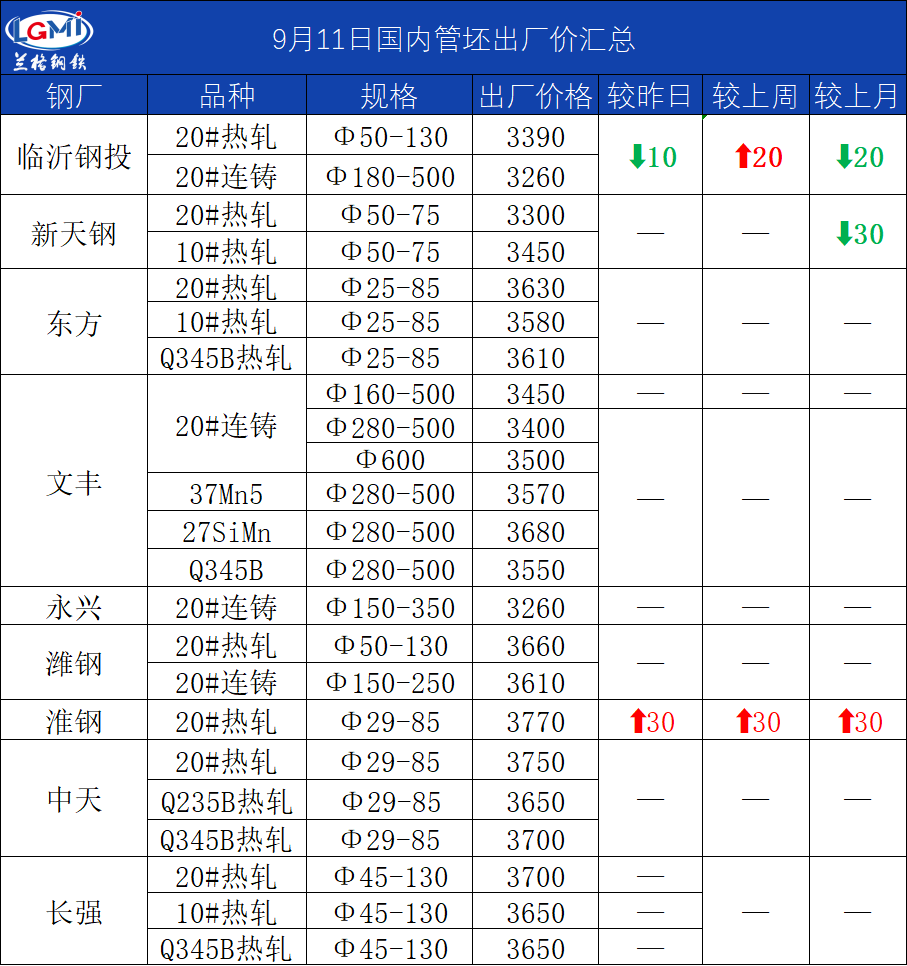• 9月10日(11:00)主导钢厂20#热轧管坯出厂价