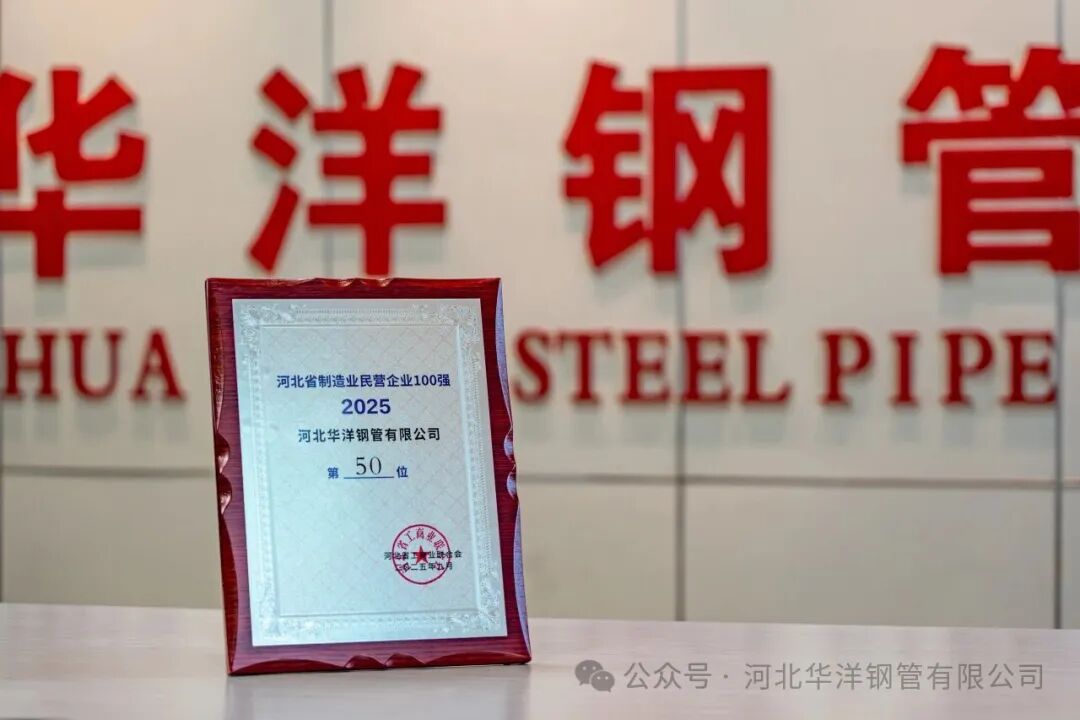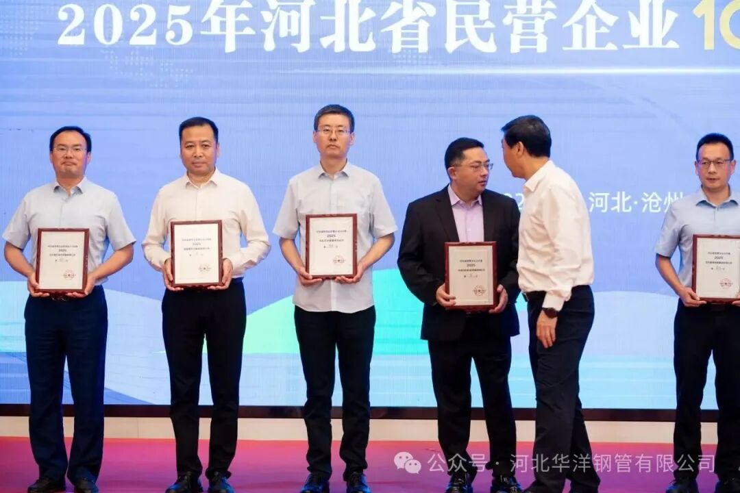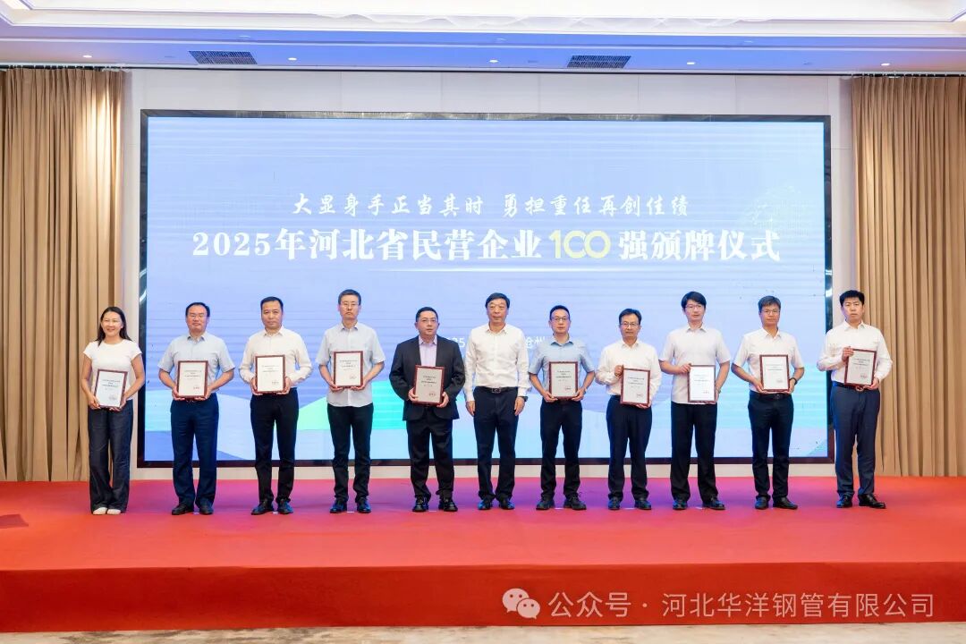 9 月 5 日下午,由河北省工商业联合会主办的 2025 年河北省民营企业 100 强、制造业民营企业 100 强等榜单发布会在沧州隆重召开。当下市场环境复杂,行业经营面临多重考验,而河北华洋钢管仍凭借稳健的经营韧性与扎实的综合实力,再度入围两大榜单,实现连续九年登榜。