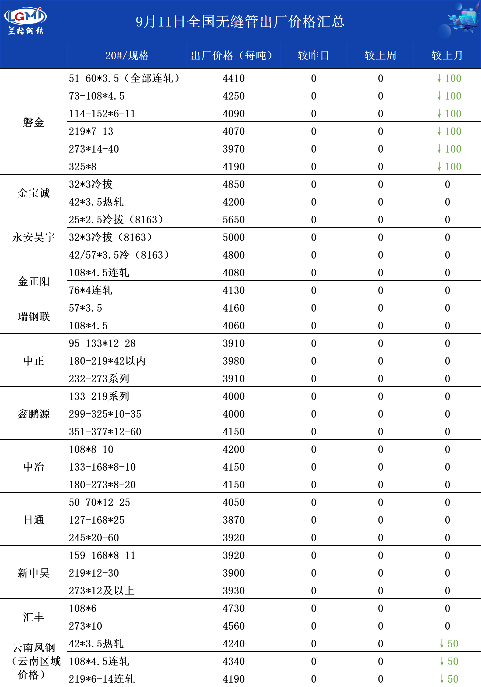 • 9月11日全国无缝管出厂价格汇总