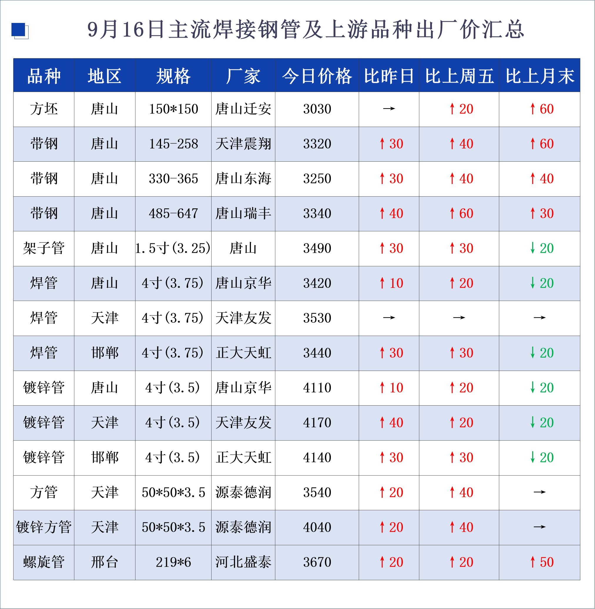 • 9月16日主流焊接钢管及上游品种出厂价格汇总