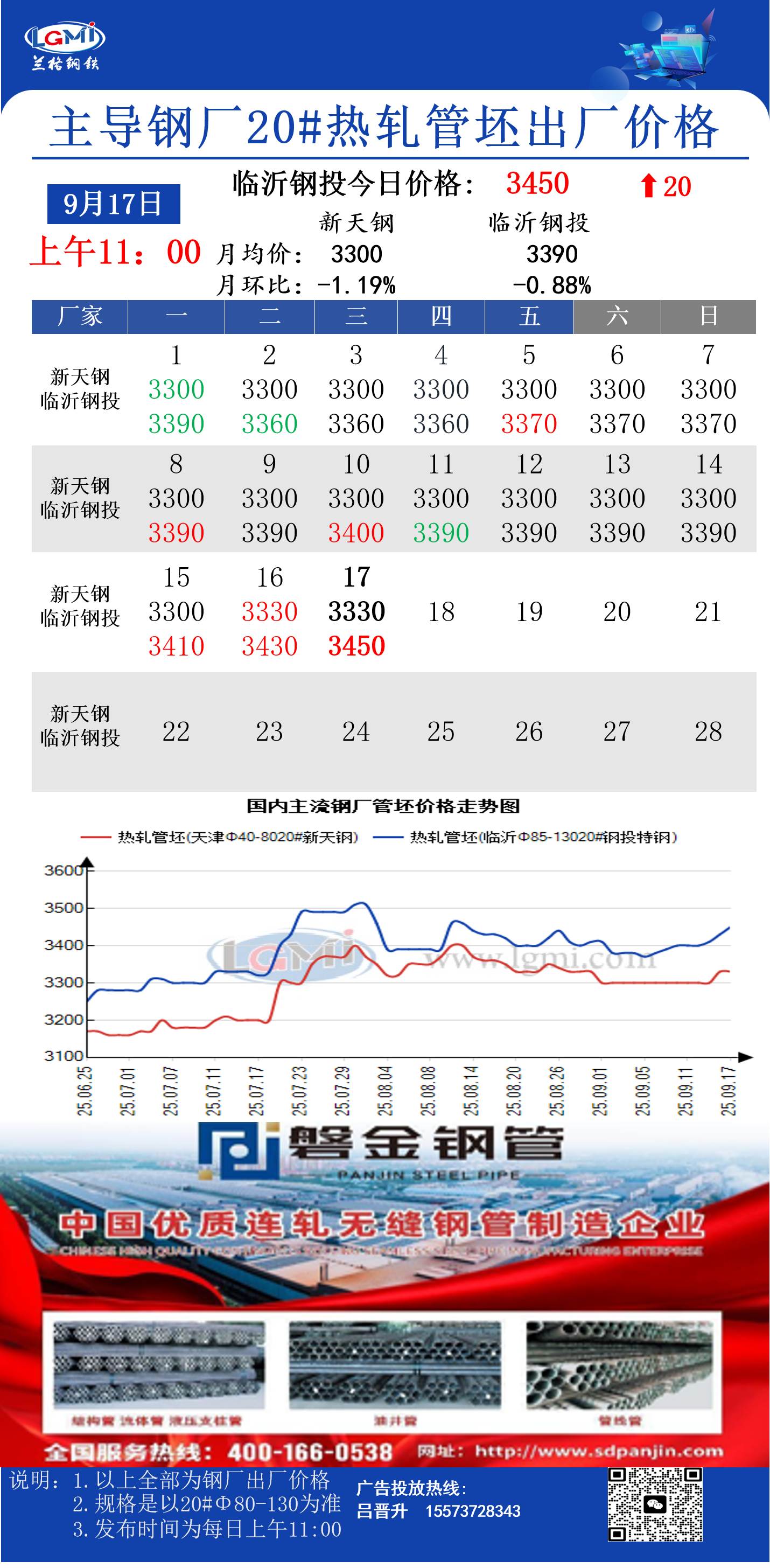 • 9月17日(11:00)主导钢厂20#热轧管坯出厂价