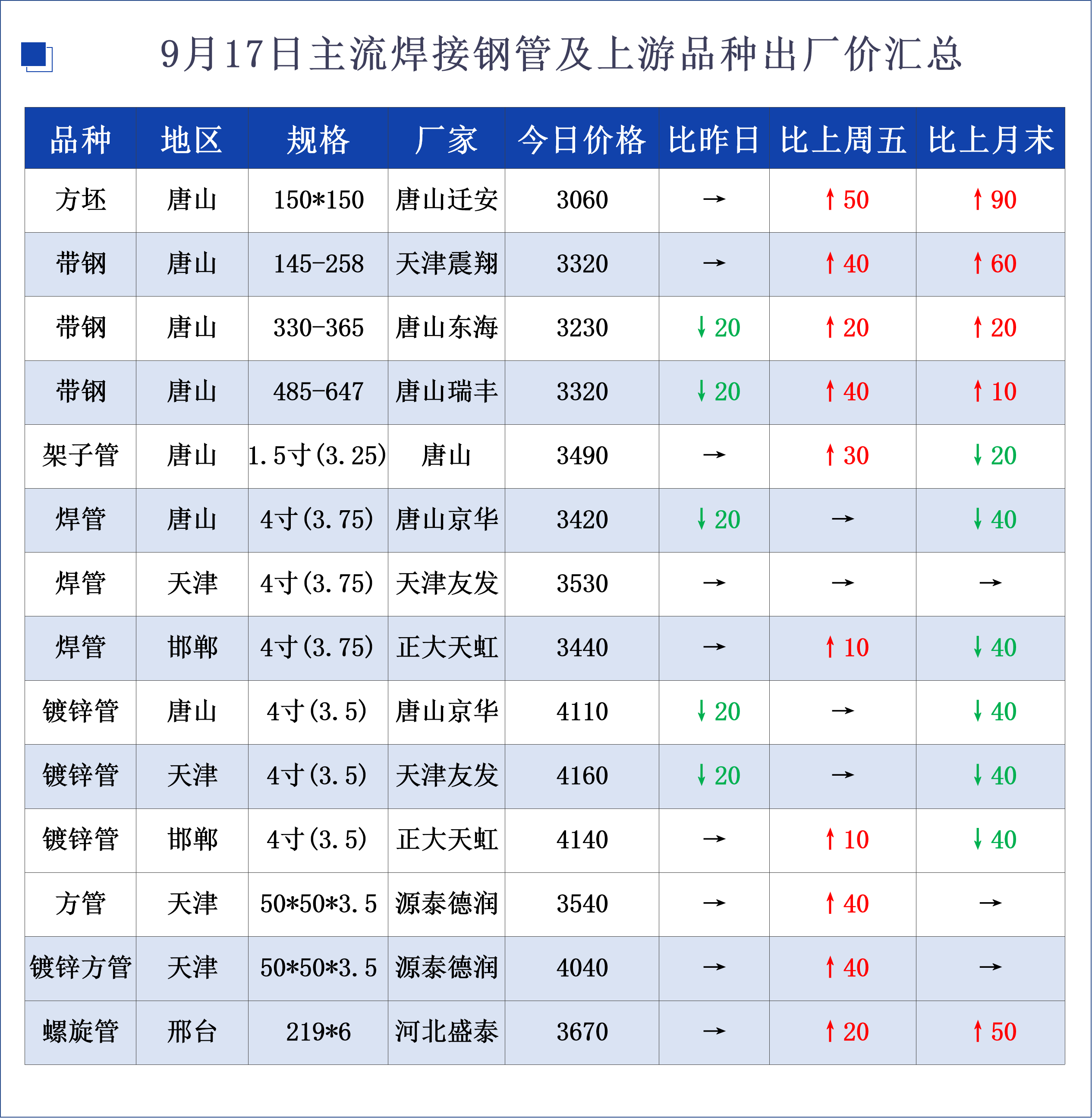 • 9月17日主流焊接钢管及上游品种出厂价格汇总