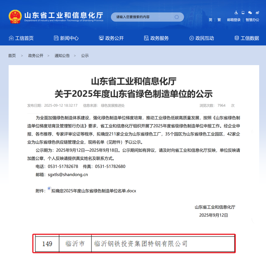 为深入践行习近平生态文明思想,积极响应山东省绿色制造体系建设号召,特钢公司始终坚持“环保是企业生命线”的发展理念,以绿色制造、节能降耗和环境治理为核心路径,以成功创建省级“绿色工厂”为阶段目标,系统推进环保设施升级、全员责任落实与现场精细化管理,全面增强企业绿色竞争力。9月12日,山东省工业和信息化厅正式公布年度绿色制造单位名单,特钢公司成功入选,荣获省级“绿色工厂”称号。 此次“绿色工厂”创建过程中,得到了市、区两级主管部门的全力支持,特钢公司主要领导全程督导、周密部署,确保创建工作有序推进、取得实效。公司环保部门积极牵头、统筹协调,各兄弟部门通力协作、密切配合,共同推动各项绿色制造措施落地见效。这一荣誉的获得,标志着特钢公司在绿色转型和可持续发展方面迈出了坚实一步。