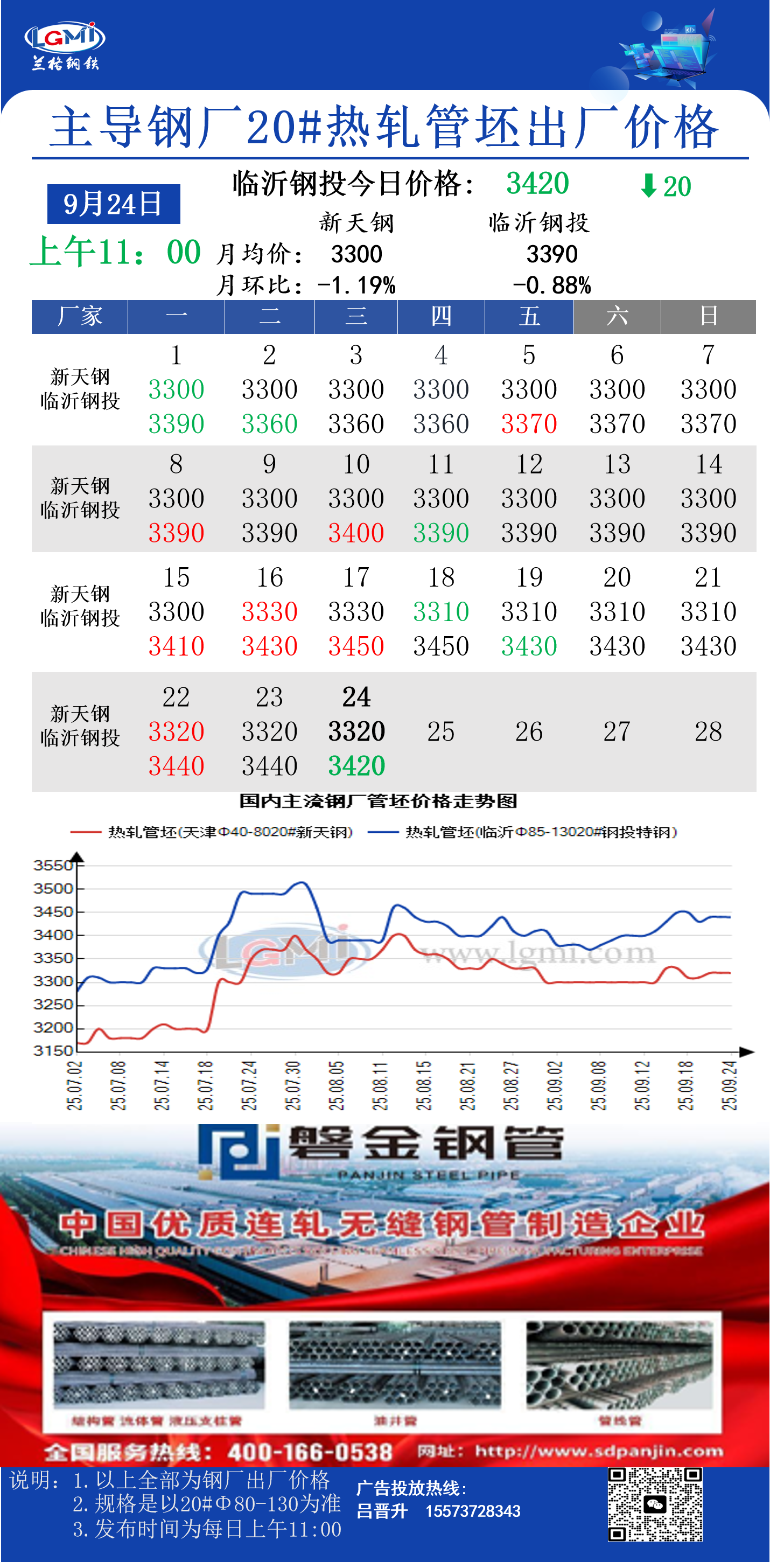 • 9月24日(11:00)主导钢厂20#热轧管坯出厂价