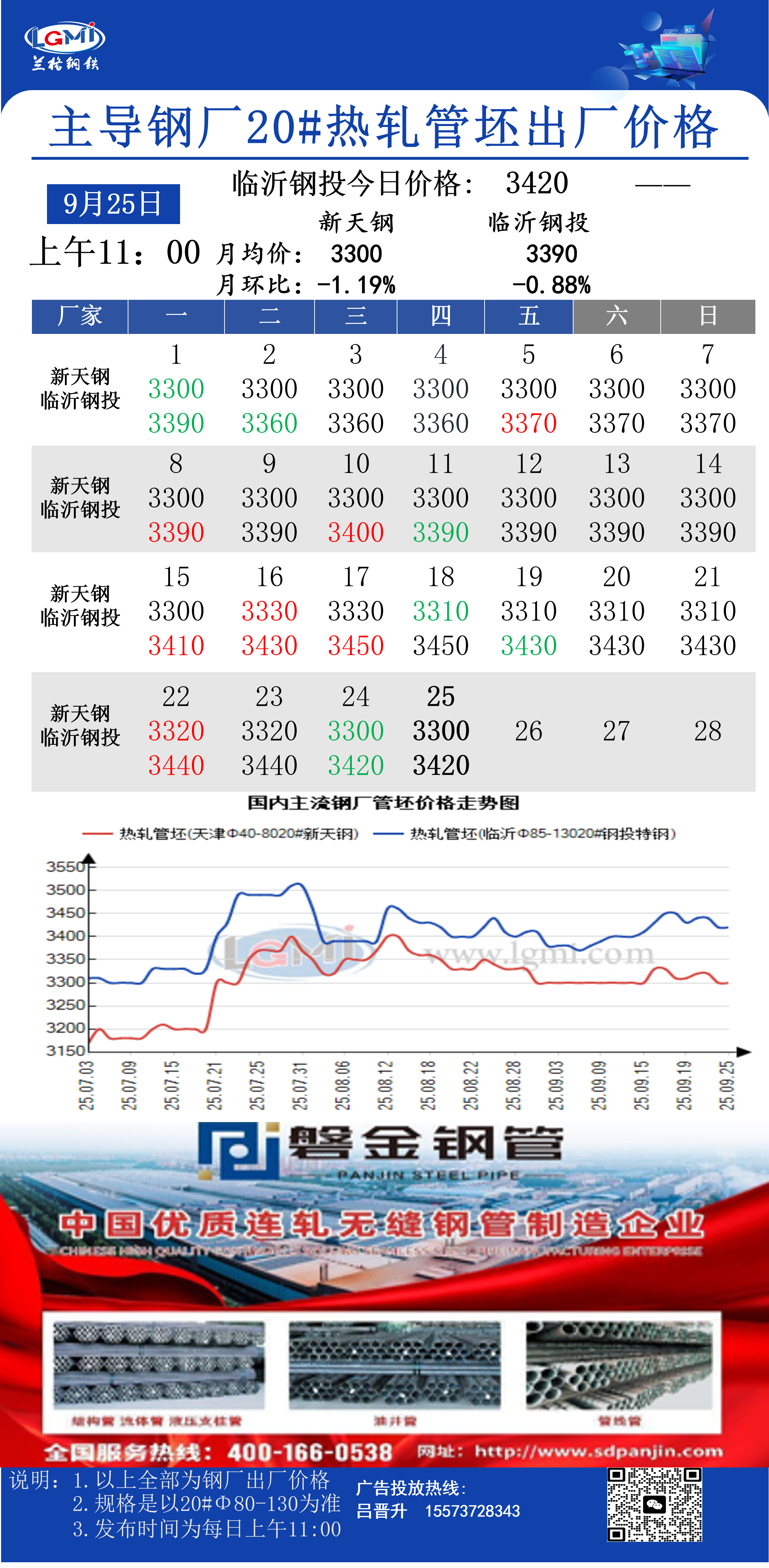 • 9月25日(11:00)主导钢厂20#热轧管坯出厂价