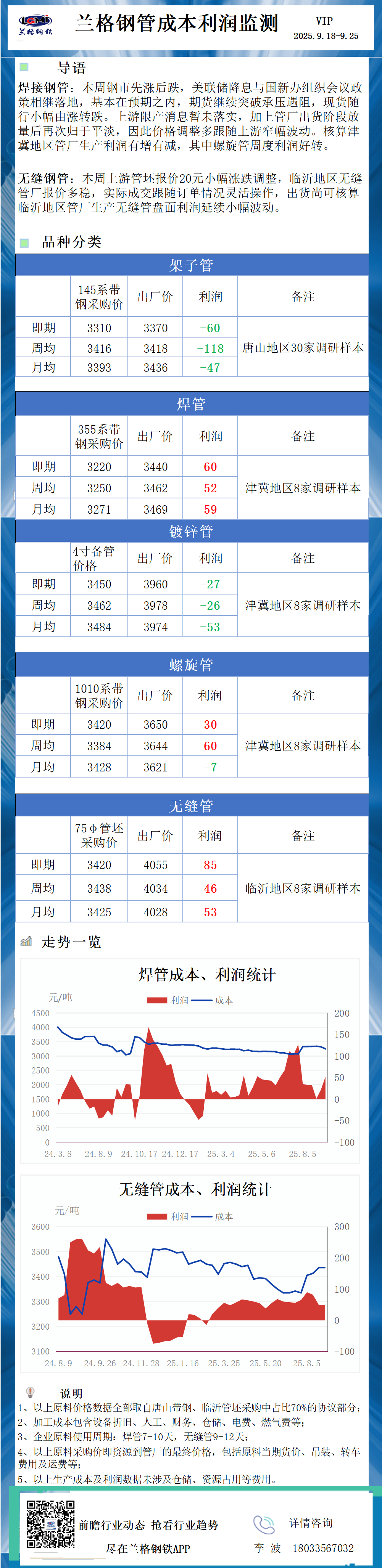 兰格调研:钢管成本利润监测(9月25日)