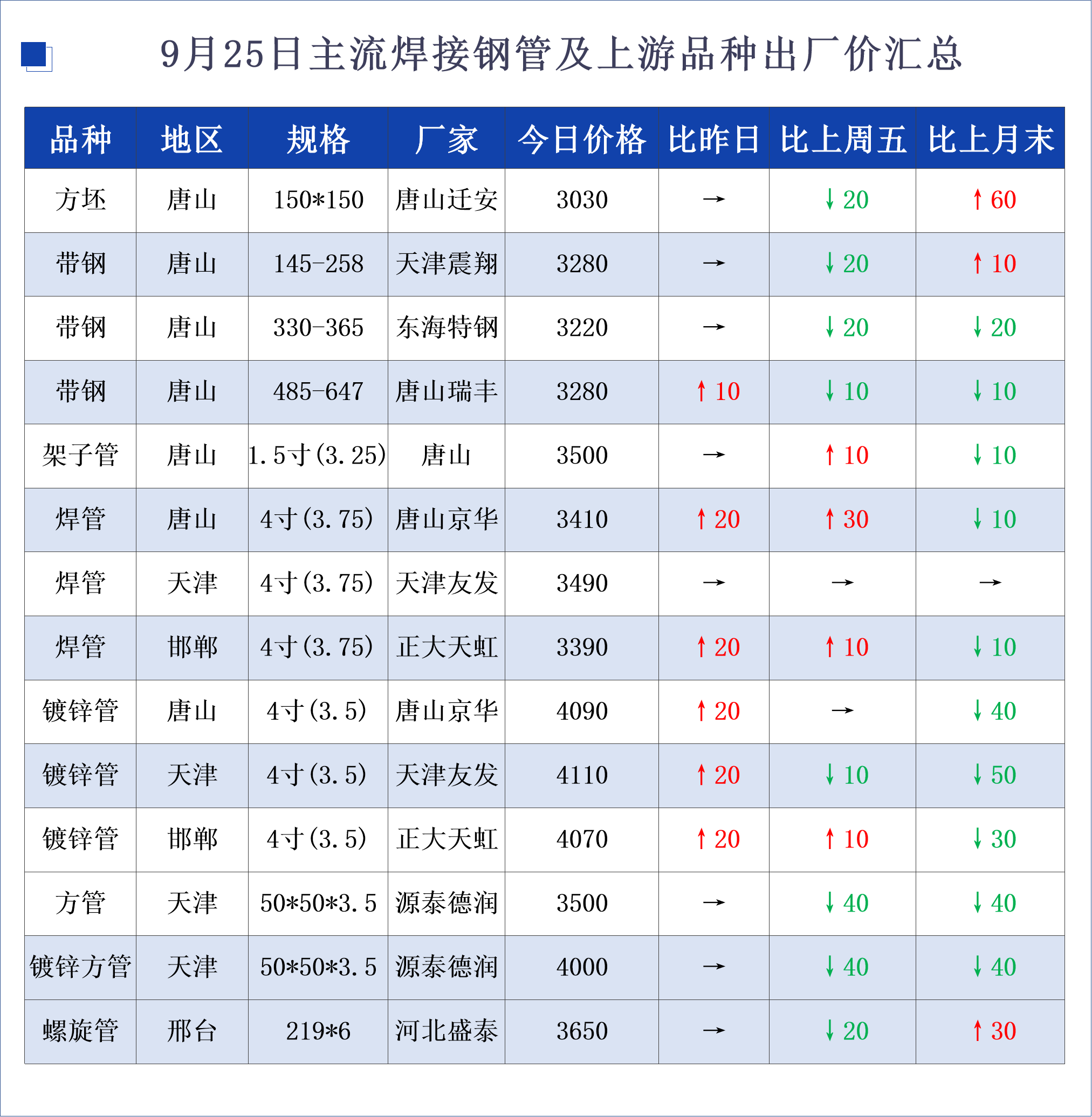 • 9月25日主流焊接钢管及上游品种出厂价格汇总