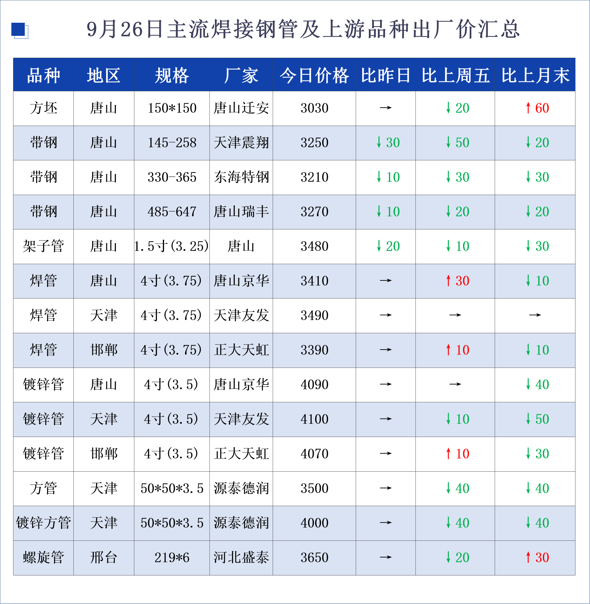 • 9月26日主流焊接钢管及上游品种出厂价格汇总