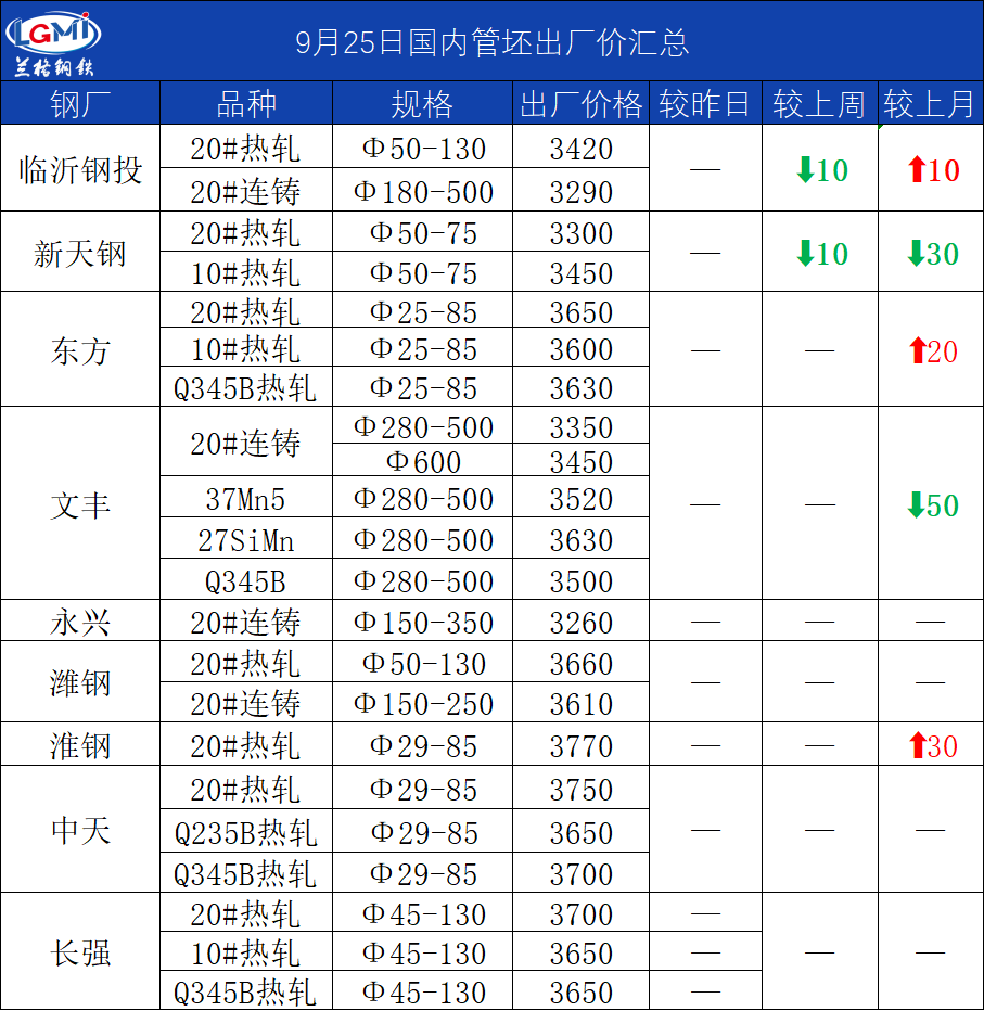 • 9月25日(11:00)主导钢厂20#热轧管坯出厂价