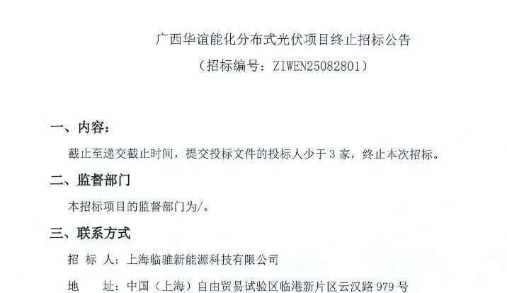 9月18日,广西华谊能化分布式光伏项目发布终止招标公告,公告显示,由于项目截止至递交截止时间,提交投标文件的投标人少于3家,故终止本次招标。项目招标人为上海临骓新能源科技有限公司。