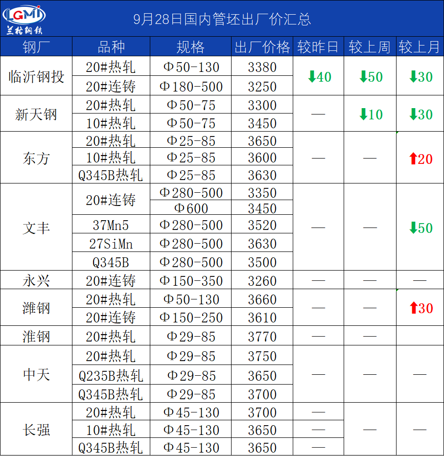 • 9月28日(11:00)主导钢厂20#热轧管坯出厂价