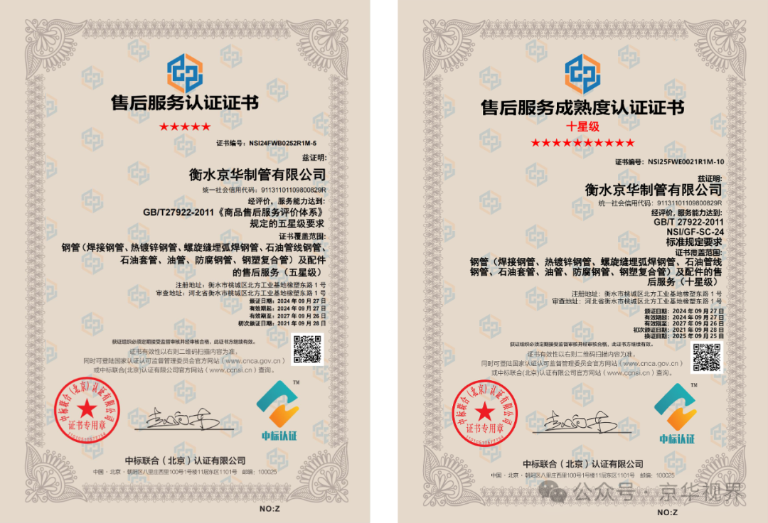 2025年9月,公司再次顺利通过售后服务体系专项审核,获得"售后服务认证五星级证书"与"售后服务成熟度认证十星级证书"双项荣誉。