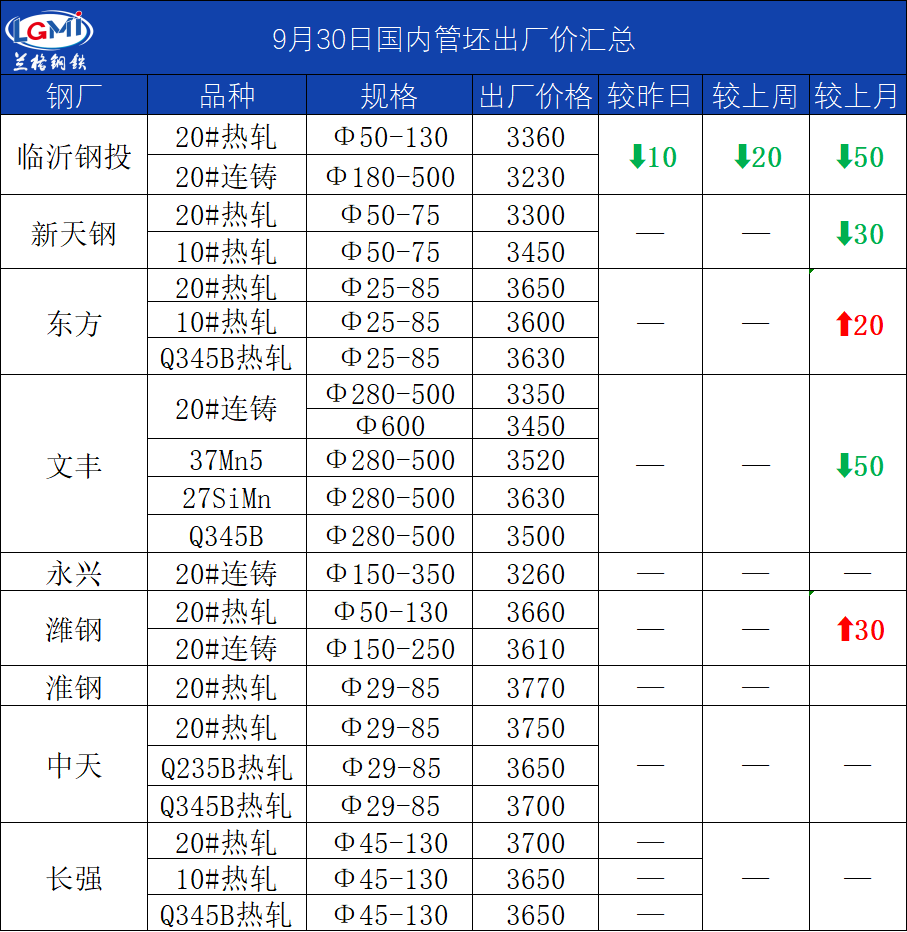 • 9月30日(11:00)主导钢厂20#热轧管坯出厂价