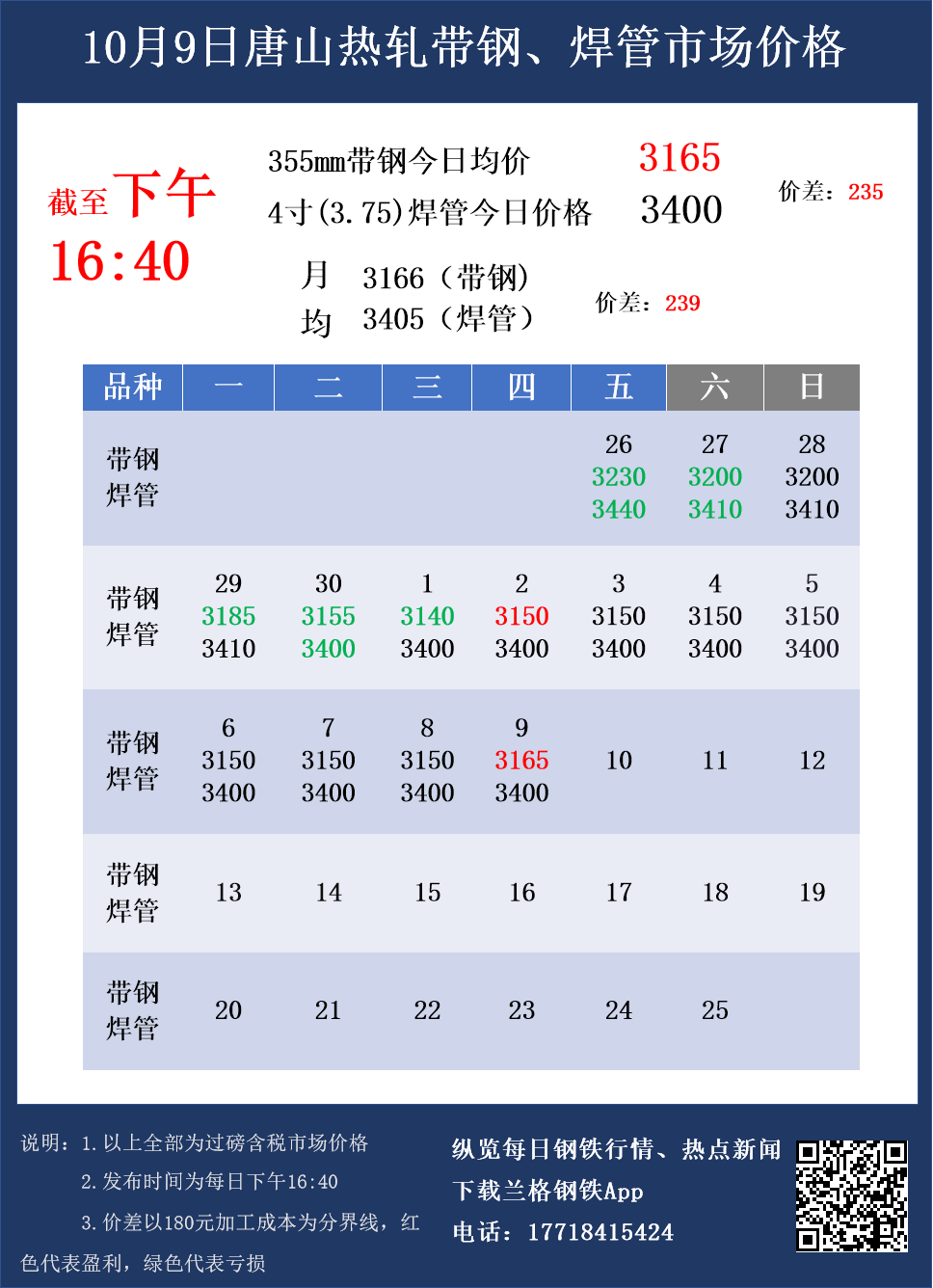 10月9日(16:40)唐山热轧带钢与焊管市场成交价格