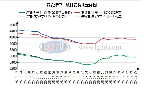 今日西安市场焊管、镀锌管报价主稳运行,成交不及预期。兰格钢铁云商平台监测数据显示,截至2025年9月28日,西安焊接钢管价格:4寸(3.75)焊管过磅含税价:西安友发报价3570元(吨价,下同),正大报3570元,比上一个交易日价格持稳;4寸(3.75) 镀锌管过磅含税价:西安友发报价4140元,利达报价4140元,正大报价4120元,比上个一个交易日价格持稳。