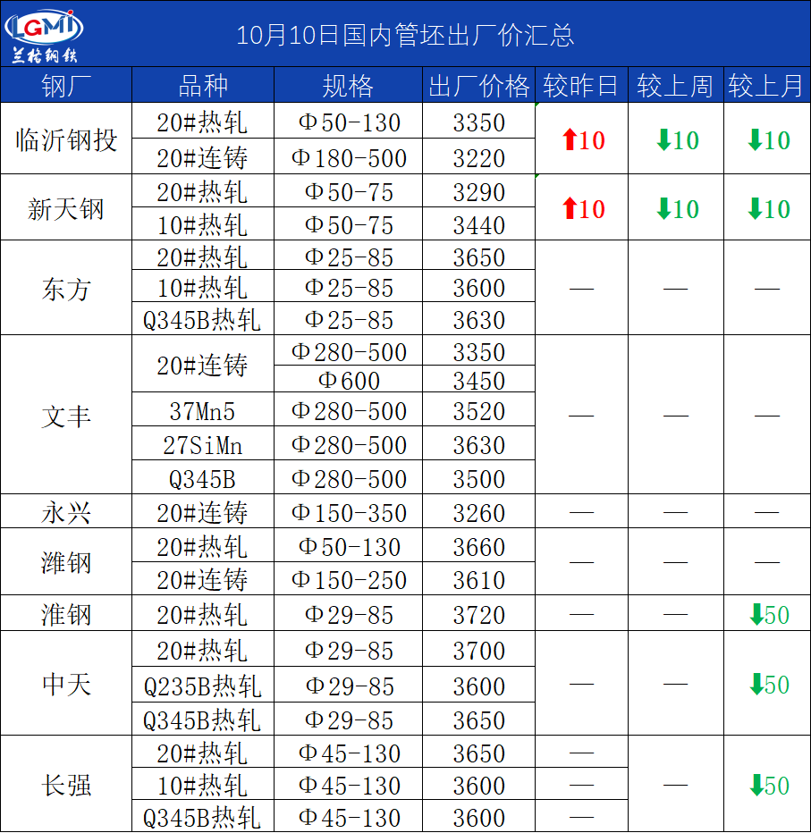 • 10月10日(11:00)主导钢厂20#热轧管坯出厂价