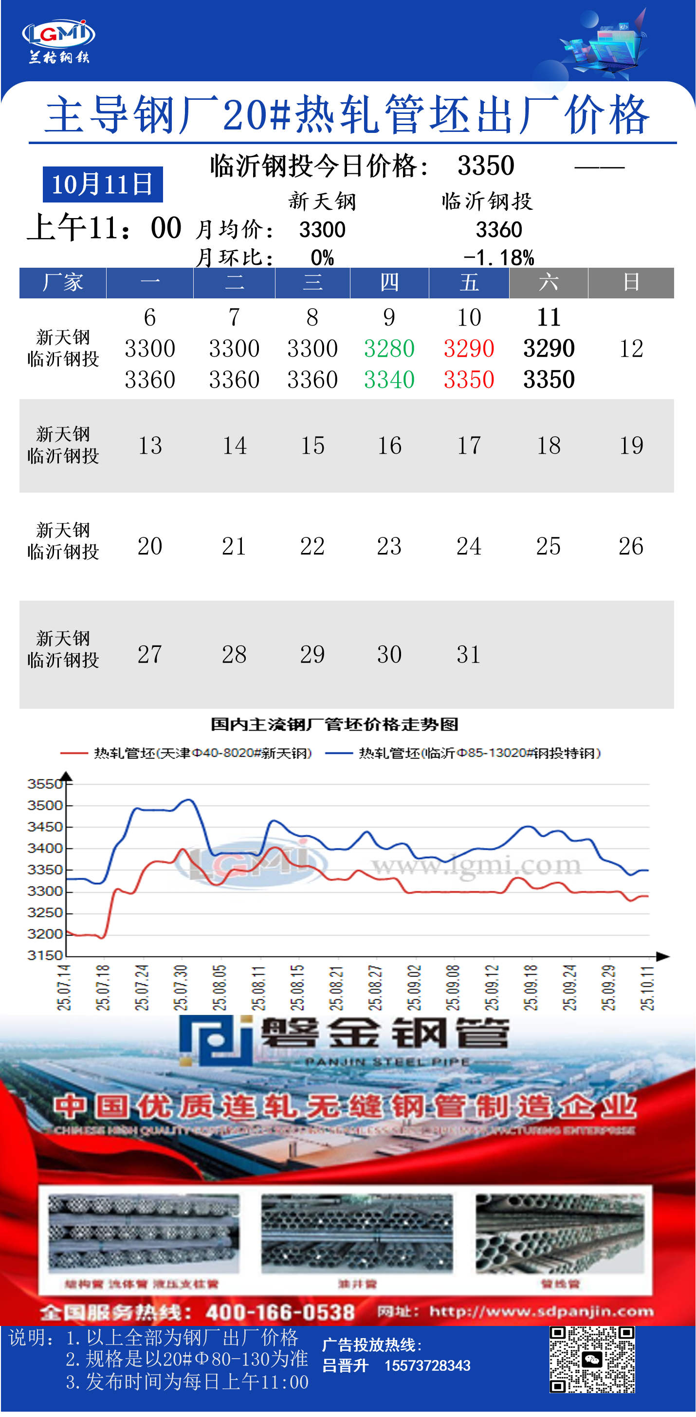 10月11日(11:00)主导钢厂20#热轧管坯出厂价