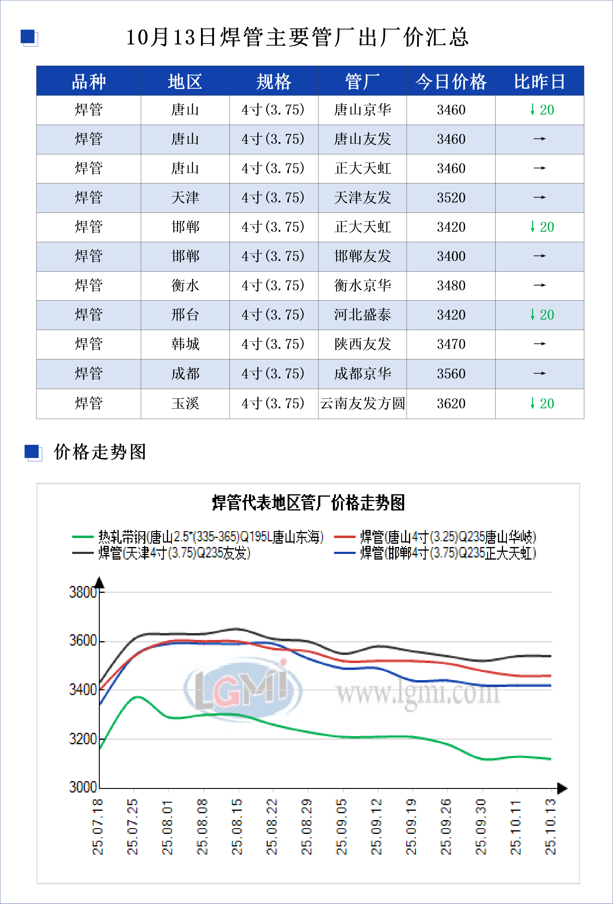 • 10月11日主流焊接钢管及上游品种出厂价格汇总