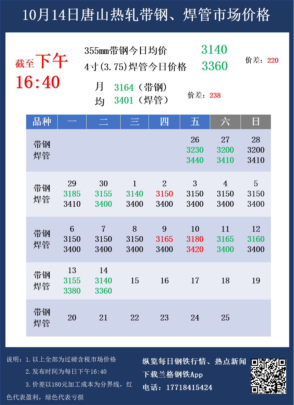 10月14日(16:40)唐山热轧带钢与焊管市场成交价格