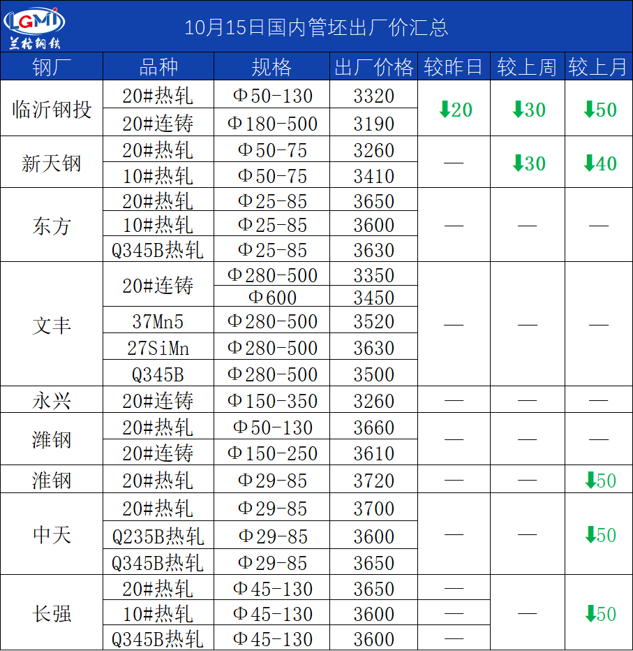 • 10月15日(11:00)主导钢厂20#热轧管坯出厂价