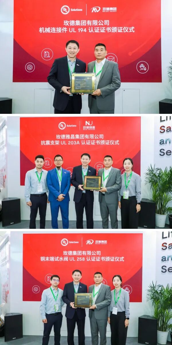 13日上午,在UL展位,UL Solutions全球副总裁、中国大陆及香港地区总经理吴大伟颁发给玫德集团机械连接件 UL 194 认证证书、抗震支架 UL 203A 认证证书、铜末端试水阀 UL 258 认证证书。 从工业厂房到商业综合体,从市政场馆到严寒地区建筑,玫德消防产品通过FM/UL/3C权威认证,以全链自研、高效适配、降本增效的核心优势,打造覆盖“智能防控-精准连接-核心控制-稳固支撑”的全链条消防解决方案,为全球客户构筑安全屏障。 |