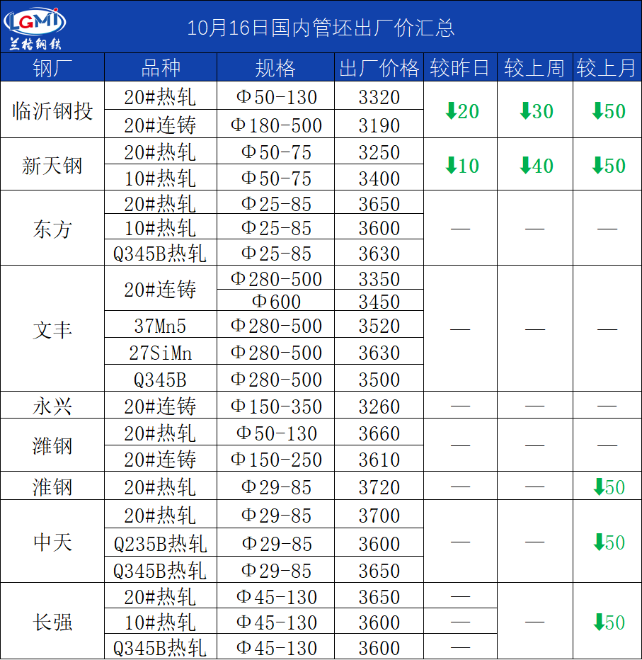 • 10月16日(11:00)主导钢厂20#热轧管坯出厂价