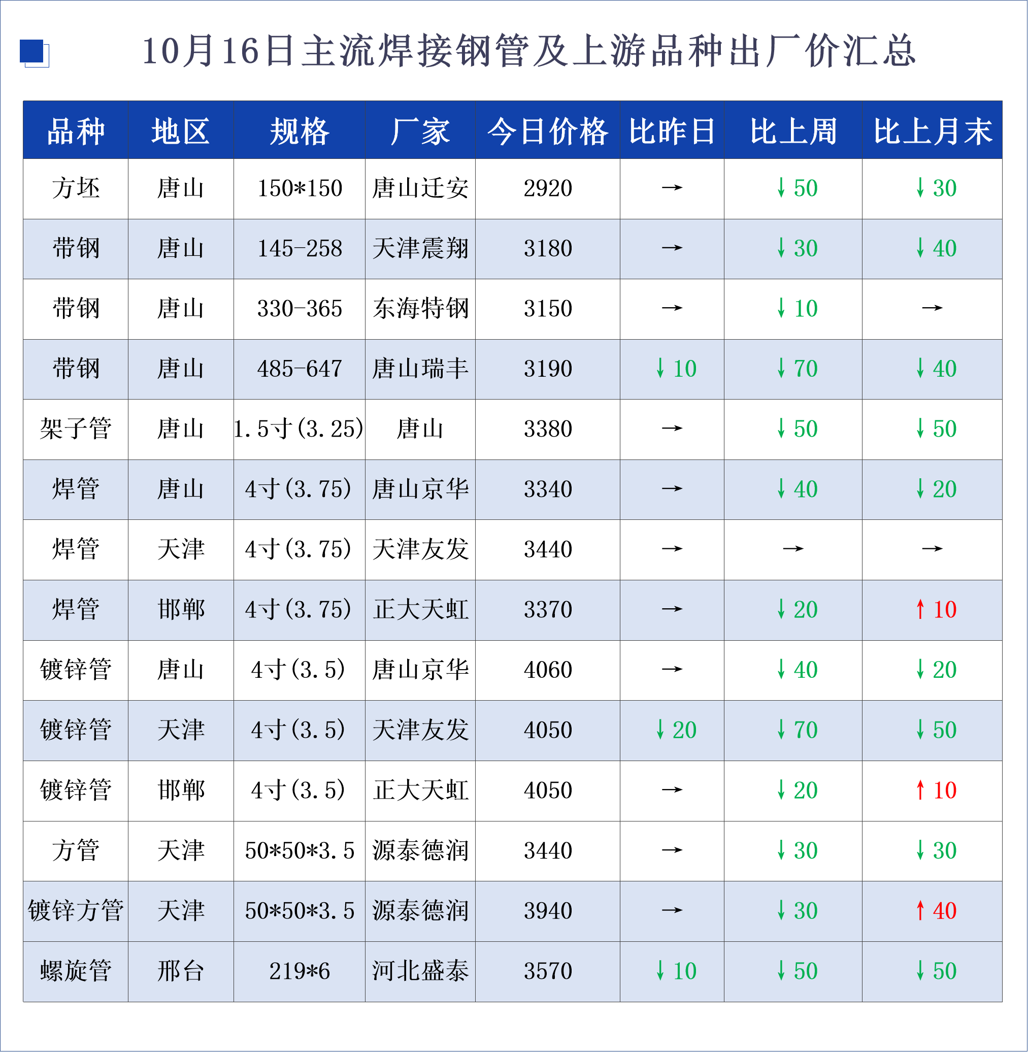 10月16日主流焊接钢管及上游品种出厂价格汇总