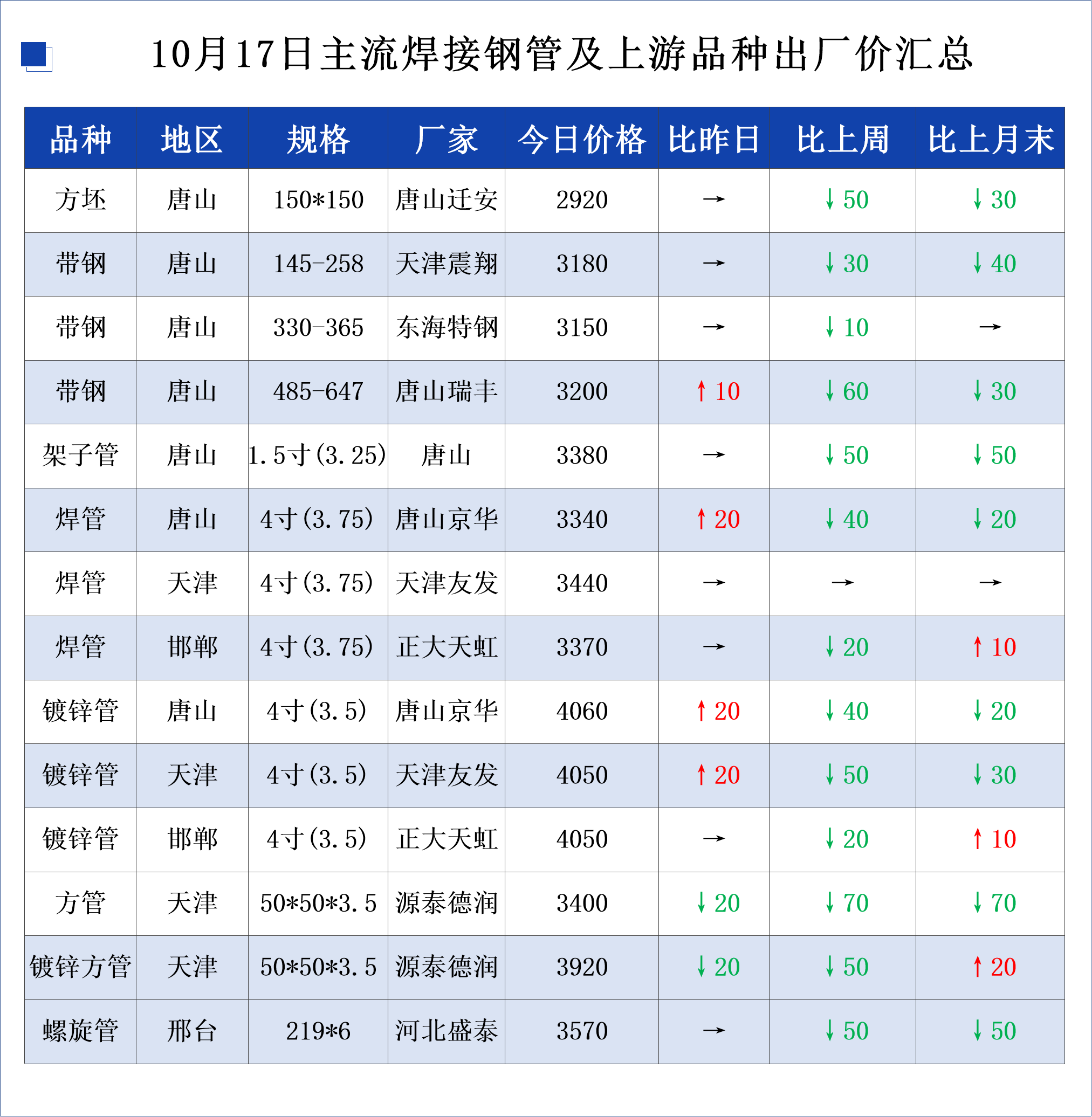 • 10月17日主流焊接钢管及上游品种出厂价格汇总