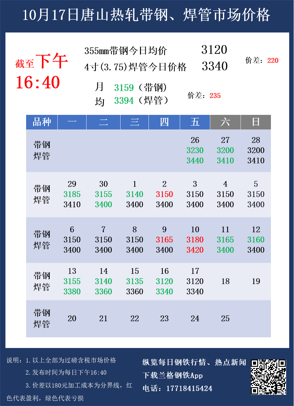 10月17日(16:40)唐山热轧带钢与焊管市场成交价格