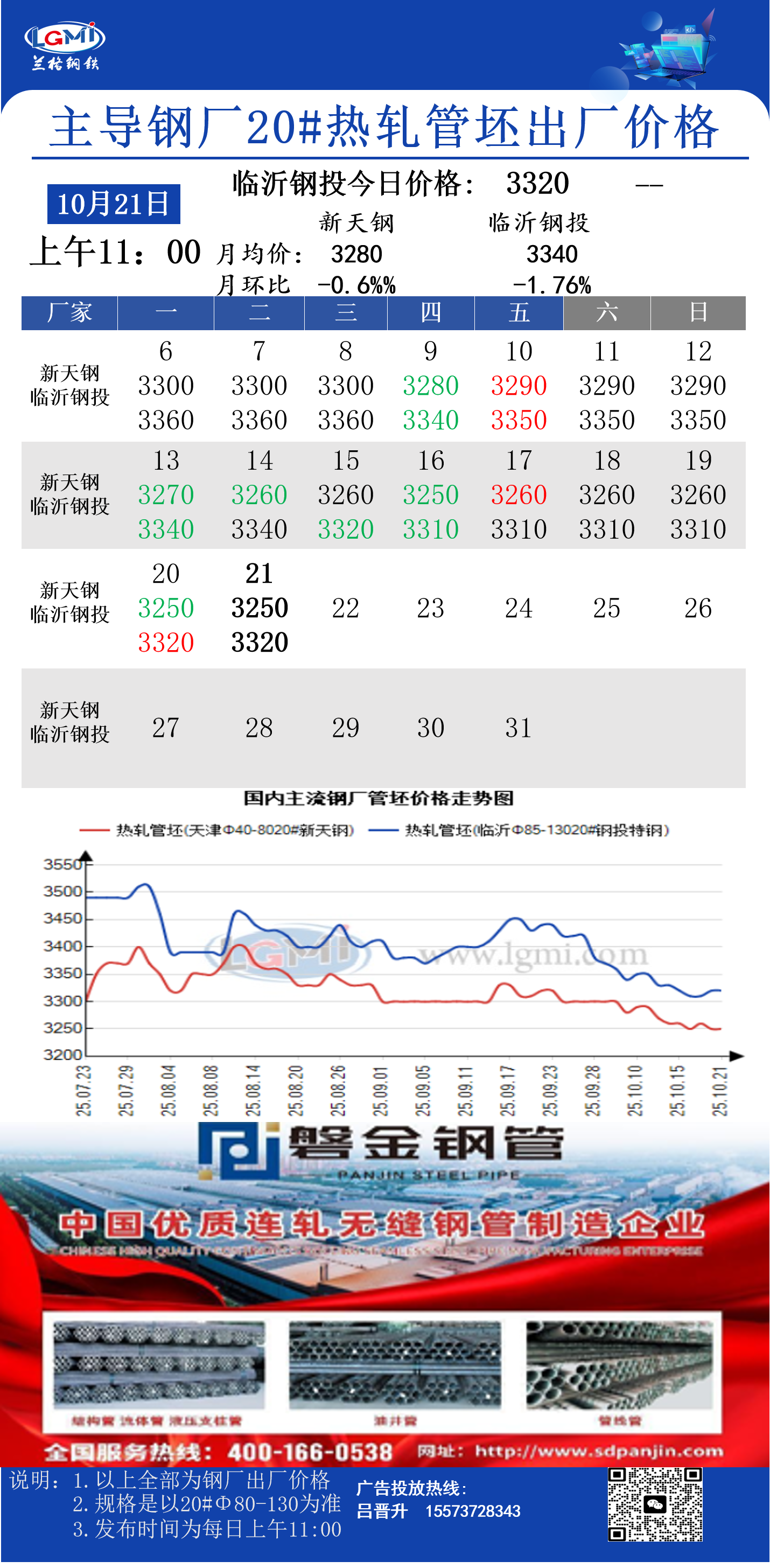• 10月21日(11:00)主导钢厂20#热轧管坯出厂价