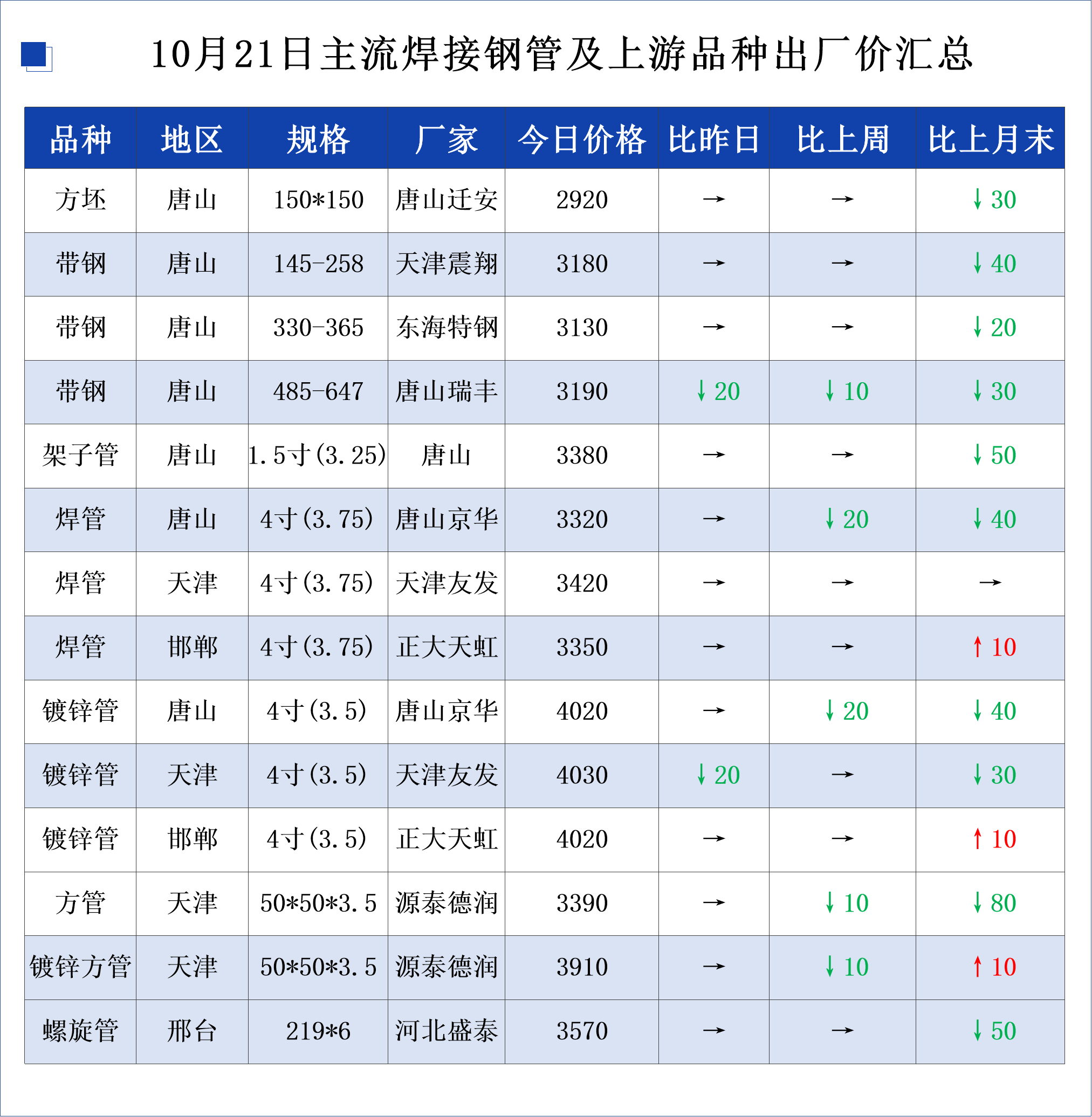 • 10月21日主流焊接钢管及上游品种出厂价格汇总