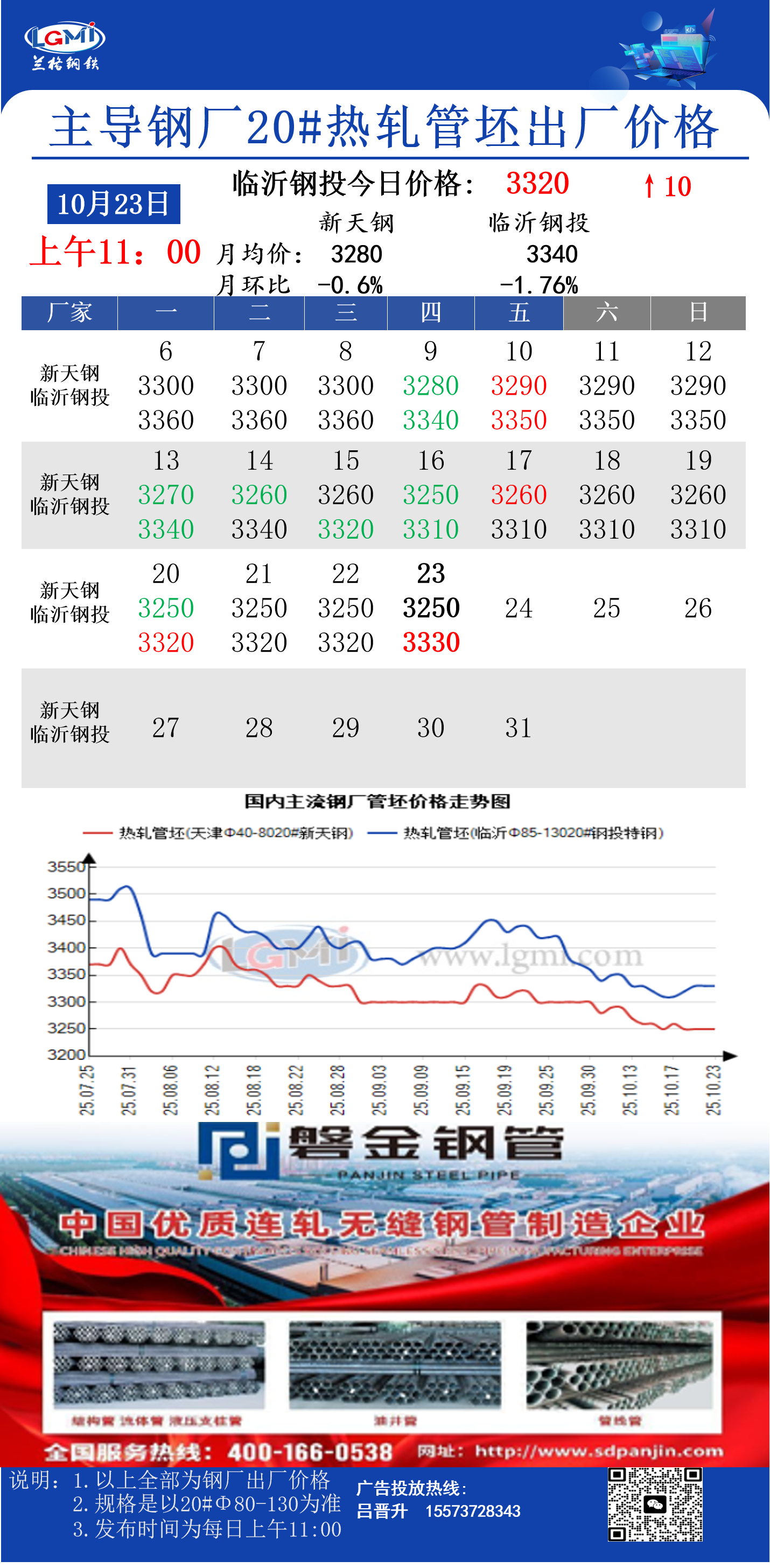 10月23日(11:00)主导钢厂20#热轧管坯出厂价