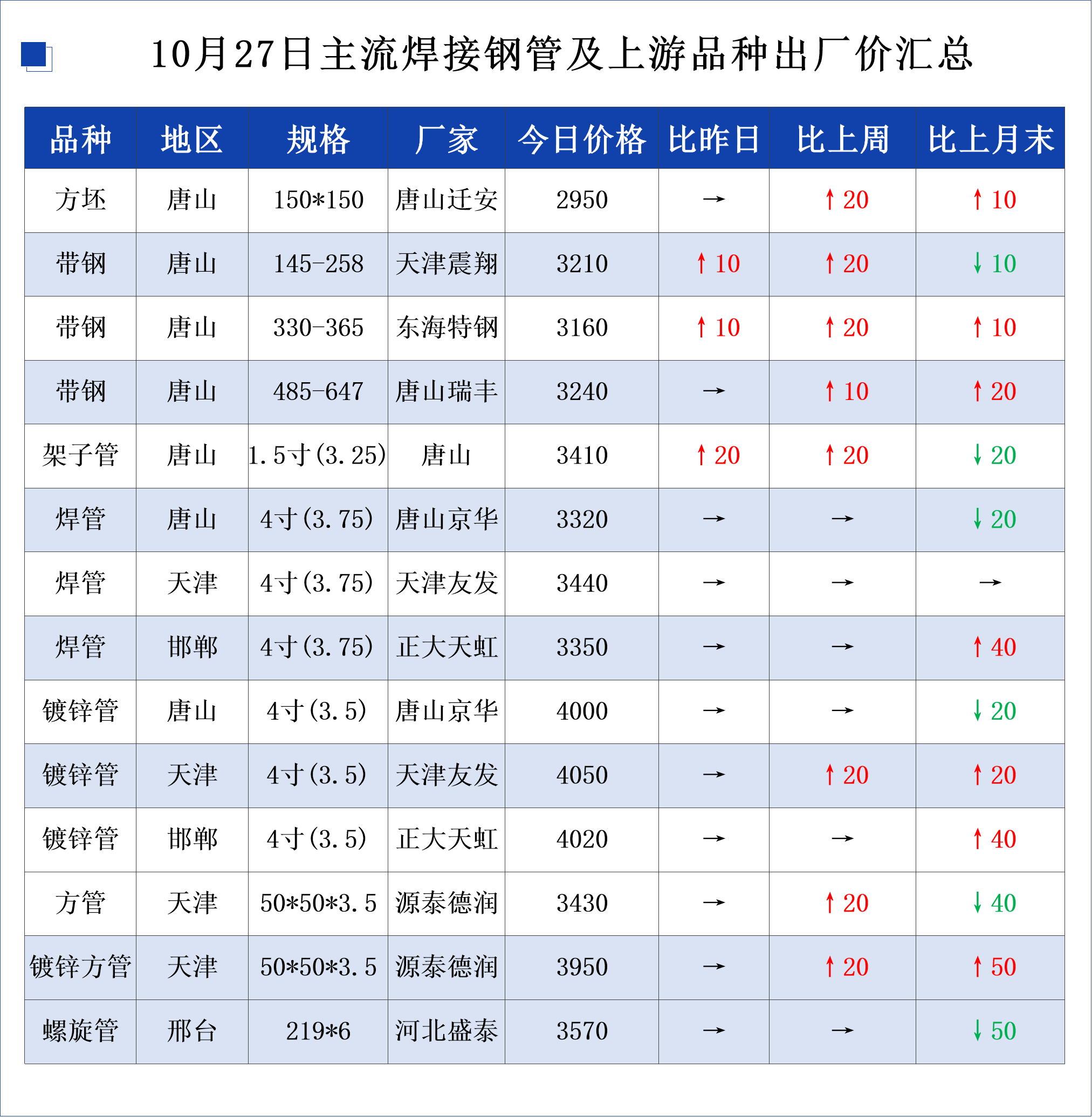 • 10月27日主流焊接钢管及上游品种出厂价格汇总