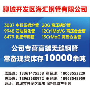 企业简介:聊城开发区海汇钢管有限公司是一家专业致力于高端无缝钢管的销售公司。常年销售江阴长江、包钢、天津大无缝、鞍钢、鲁宝、江阴华润、永安昊宇、江苏诚德等几大厂家生产的无缝钢管,以及经营各种特殊厚壁管及合金管。执行国际GB3087-2022(低中压锅炉管)、GB5310-2023(高压锅炉管)、GB9948-2025(石油裂化管)等。