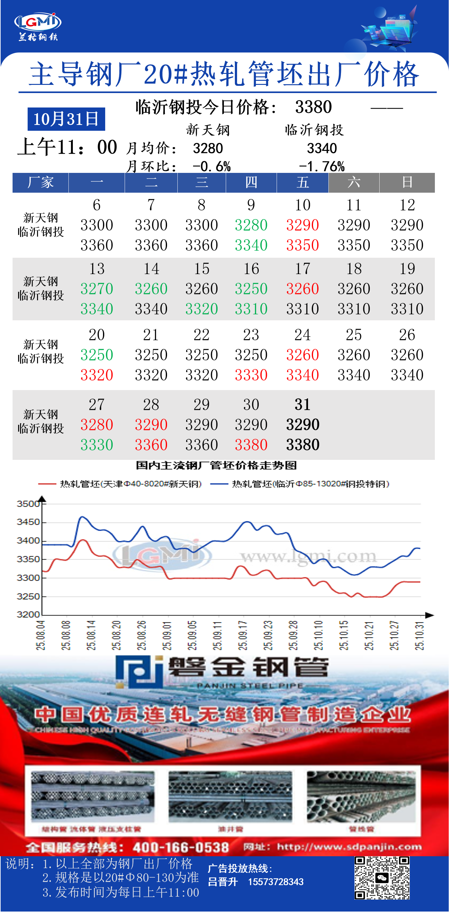• 10月31日(11:00)主导钢厂20#热轧管坯出厂价