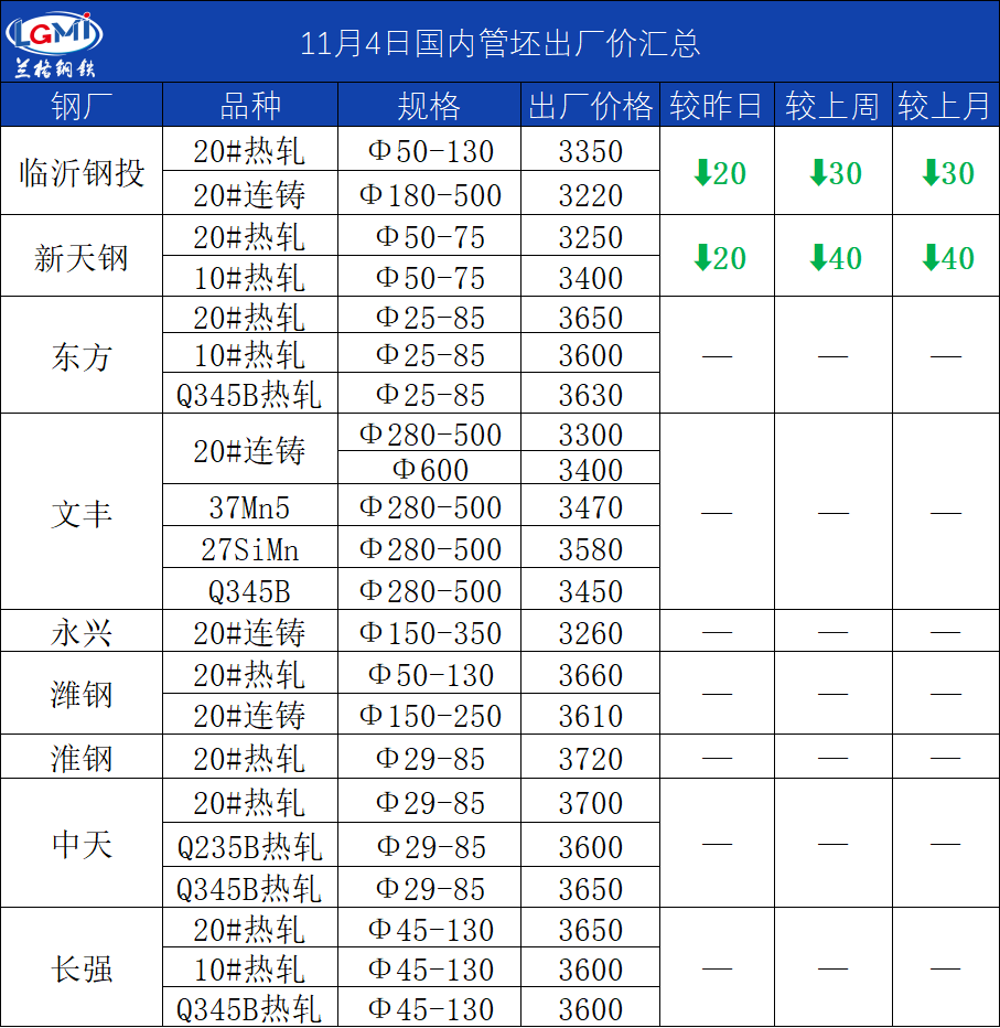 • 11月4日国内管坯出厂价汇总