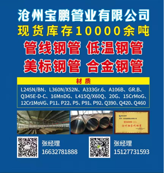 企业简介:沧州宝鹏管业有限公司(CANGZHOU BAOPENG PIPE INDUSTRY CO., LTD)坐落于中国管道装备基地——河北省孟村县希望新区,是一家集钢管现货仓储、管件生产、销售出口于一体的综合性企业。