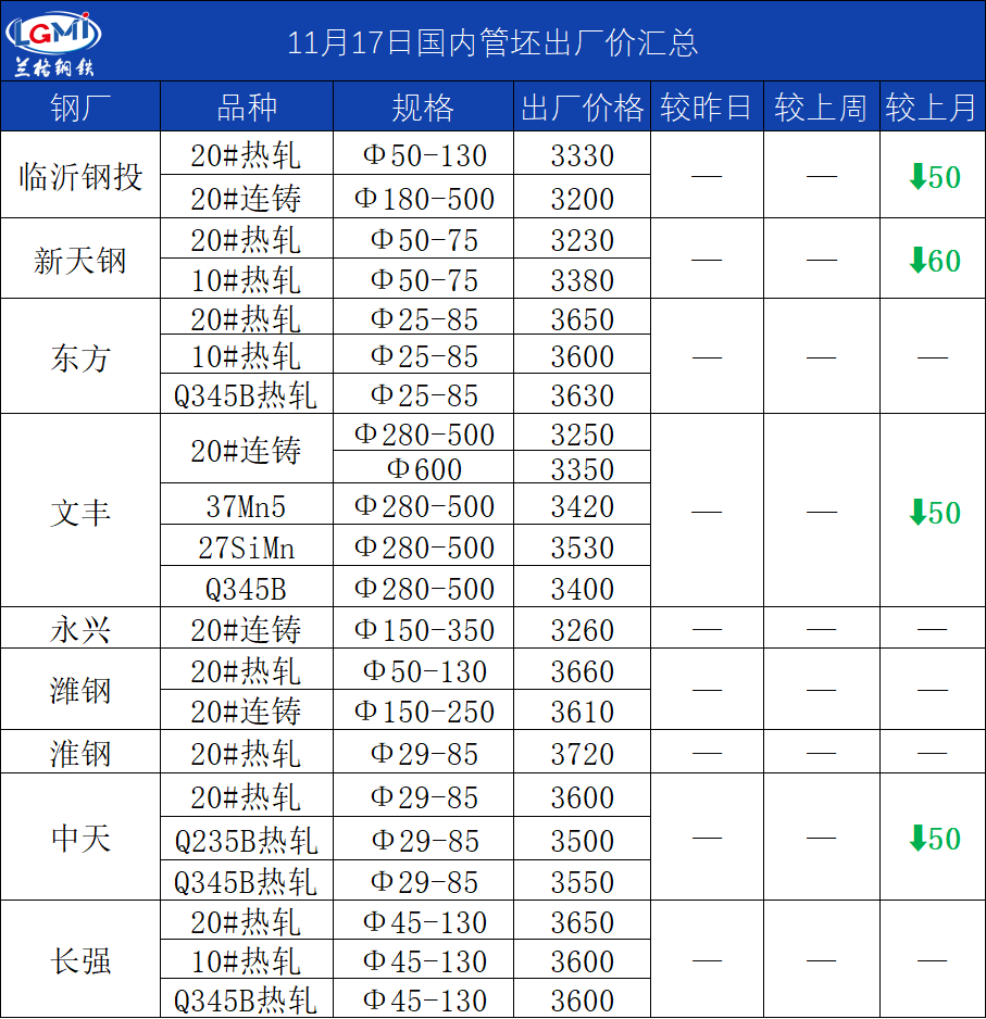 • 11月17日(11:00)主导钢厂20#热轧管坯出厂价