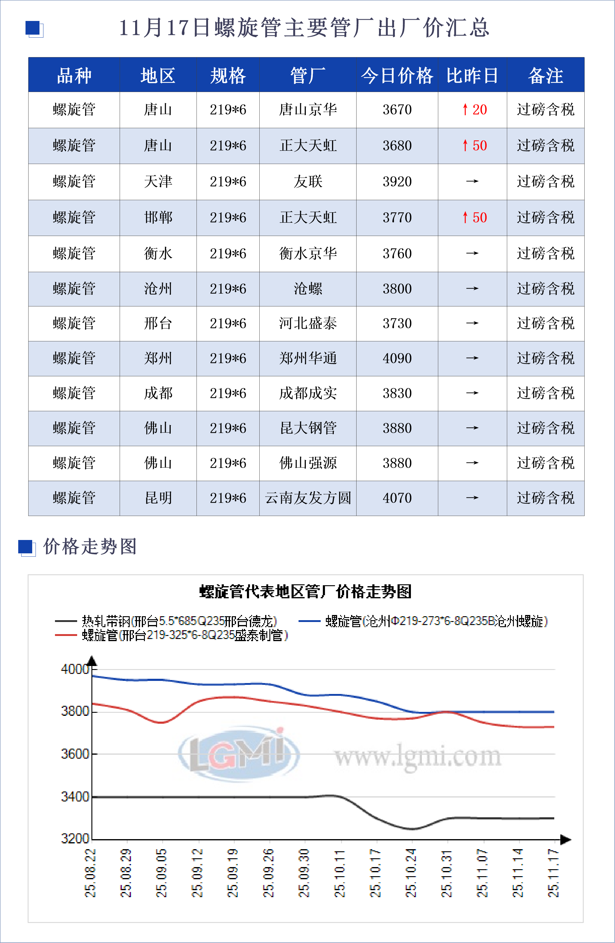 • 11月17日螺旋管主要地区管厂出厂价汇总