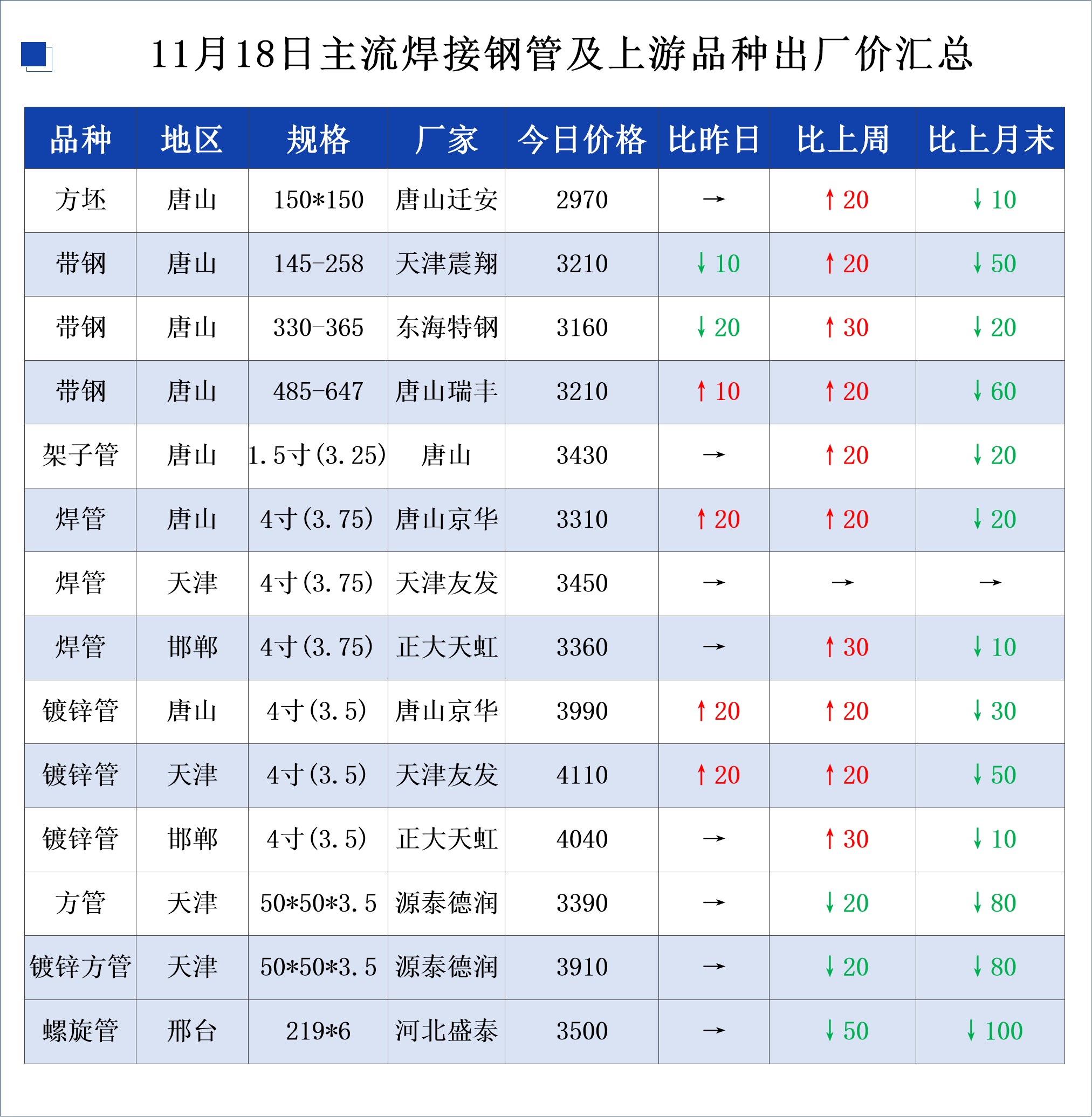 • 11月18日主流焊接钢管及上游品种出厂价格汇总