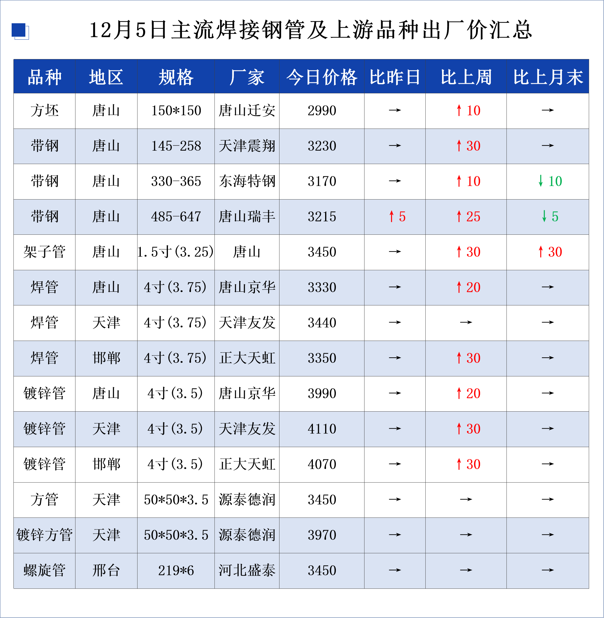 • 12月5日主流焊接钢管及上游品种出厂价格汇总