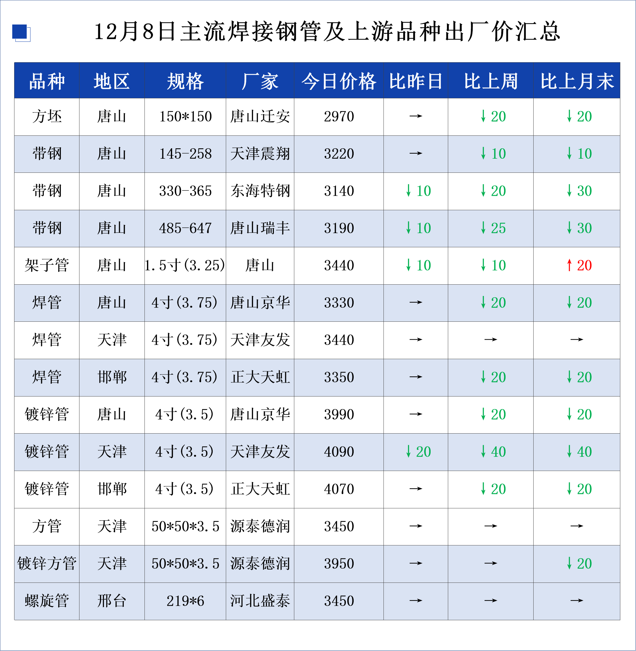 • 12月8日主流焊接钢管及上游品种出厂价格汇总