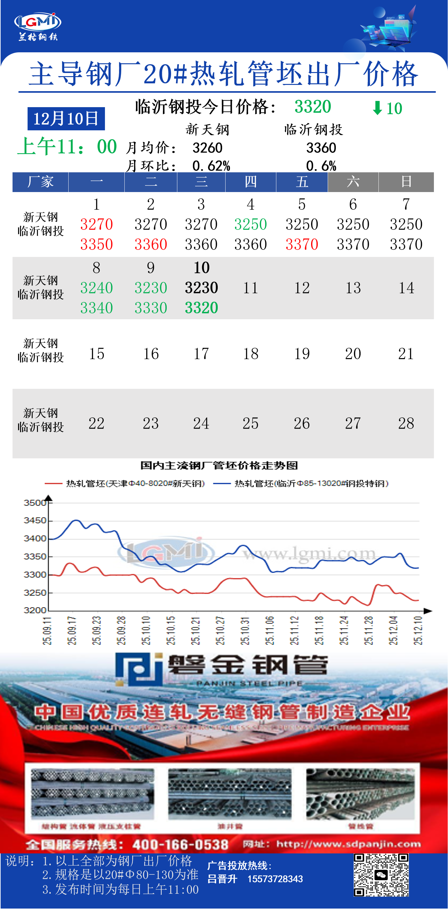 • 12月10日(11:00)主导钢厂20#热轧管坯出厂价