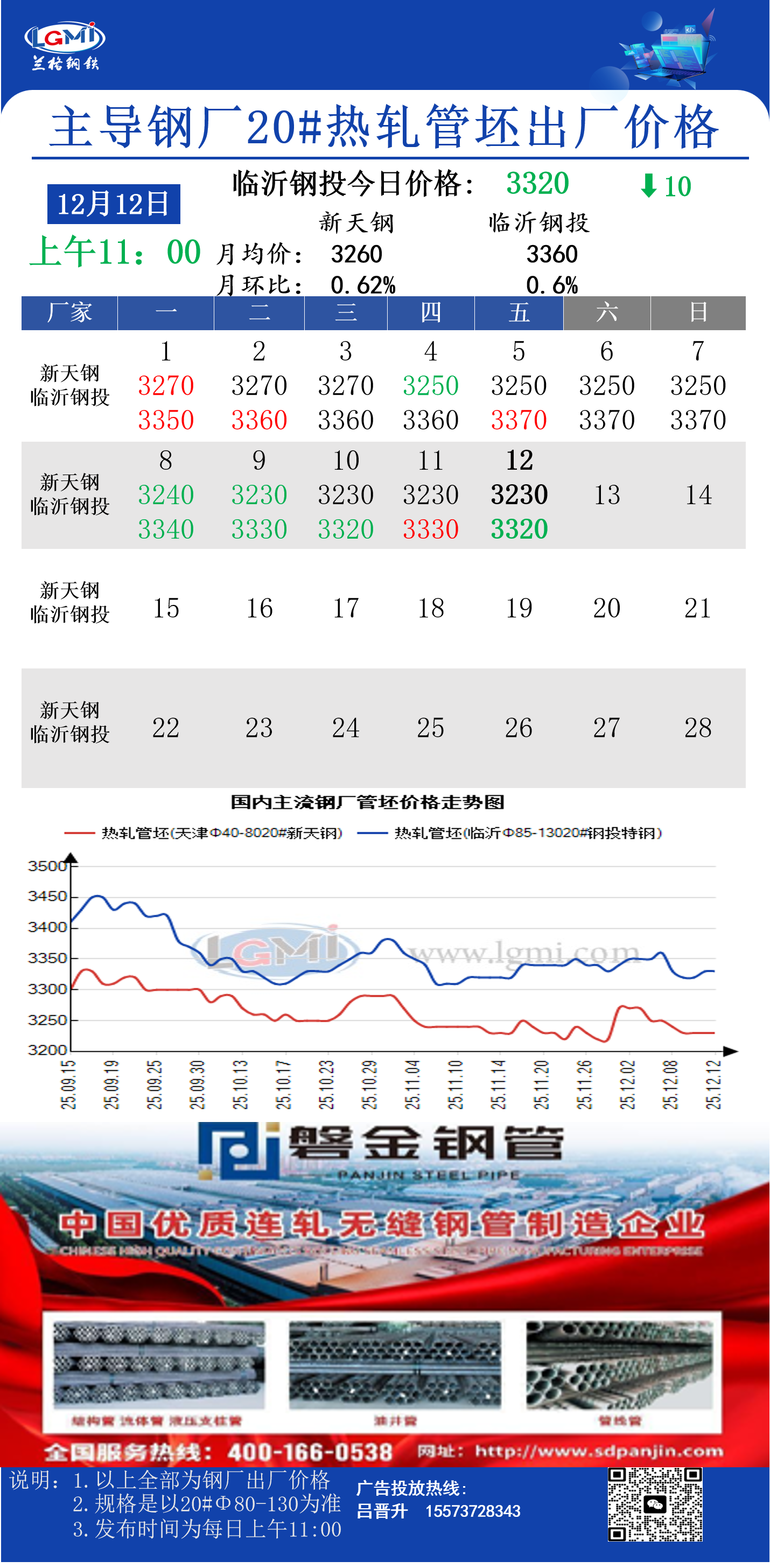 • 12月12日(11:00)主导钢厂20#热轧管坯出厂价