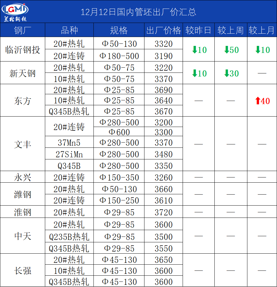 • 12月12日(11:00)主导钢厂20#热轧管坯出厂价