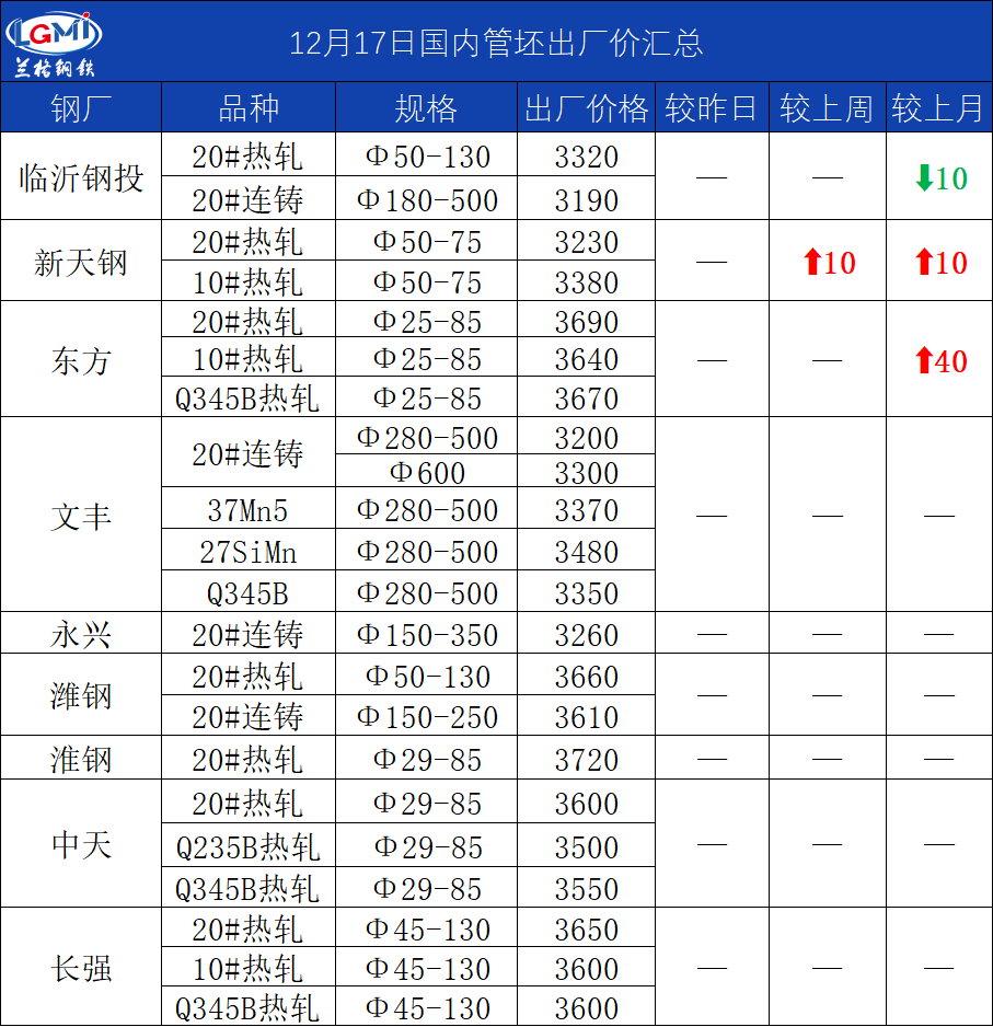 • 12月17日(11:00)主导钢厂20#热轧管坯出厂价